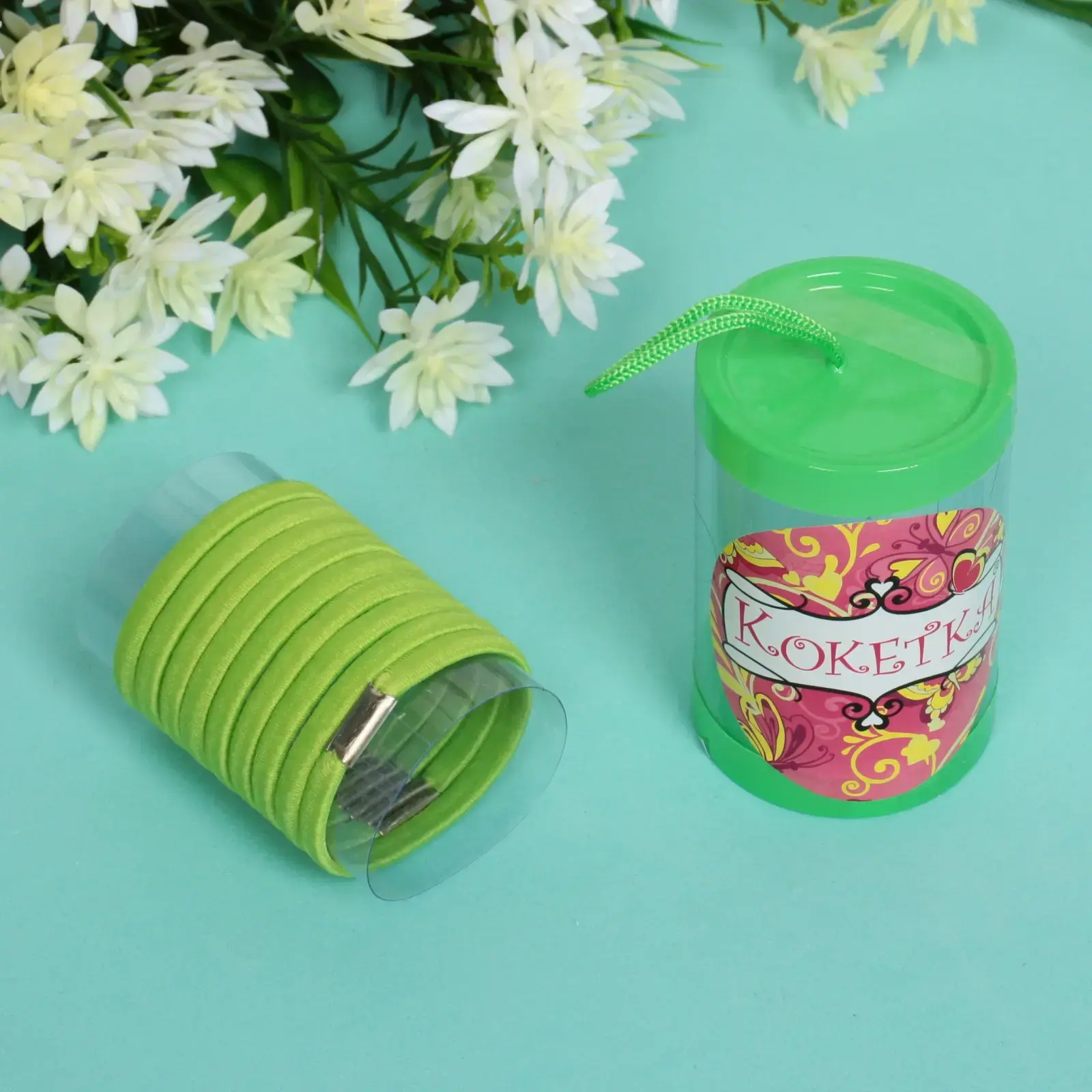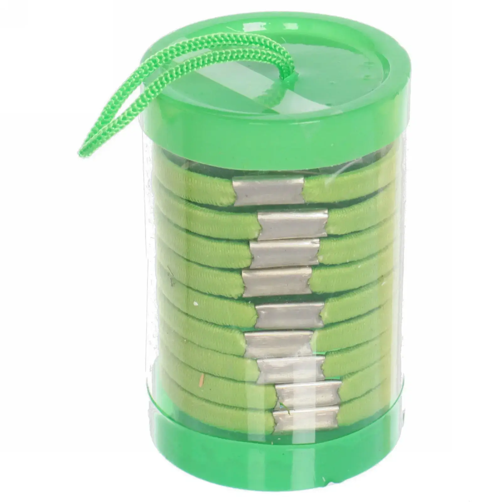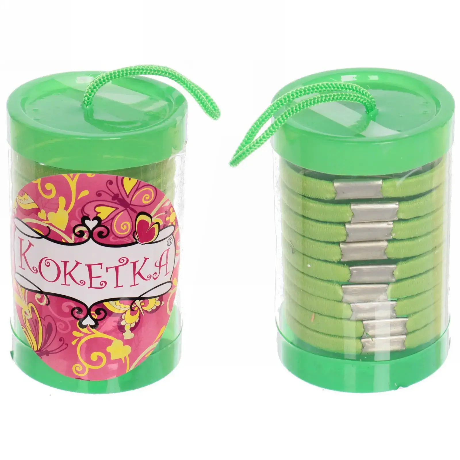 В упаковке содержится 9 резинок диаметром 4 см, выполненных из качественного текстиля. Они имеют гладкую текстуру и равномерную ширину, что делает их комфортными в носке. Резинки не только надежно фиксируют волосы, но и добавляют яркий акцент в образ. Упаковка с зеленой крышкой и ручкой делает их идеальными для хранения и транспортировки.