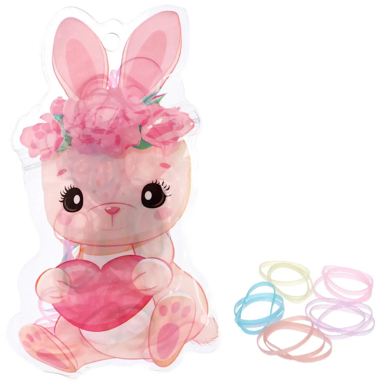 Размеры резинок составляют 17х11,5 см, что делает их удобными для хранения и использования. Упаковка выполнена в форме милого зайца, что добавляет элемент веселья и делает набор отличным подарком. Резинки представлены в нежных пастельных тонах: розовом, голубом, желтом и фиолетовом, что позволяет легко сочетать их с любыми нарядами.