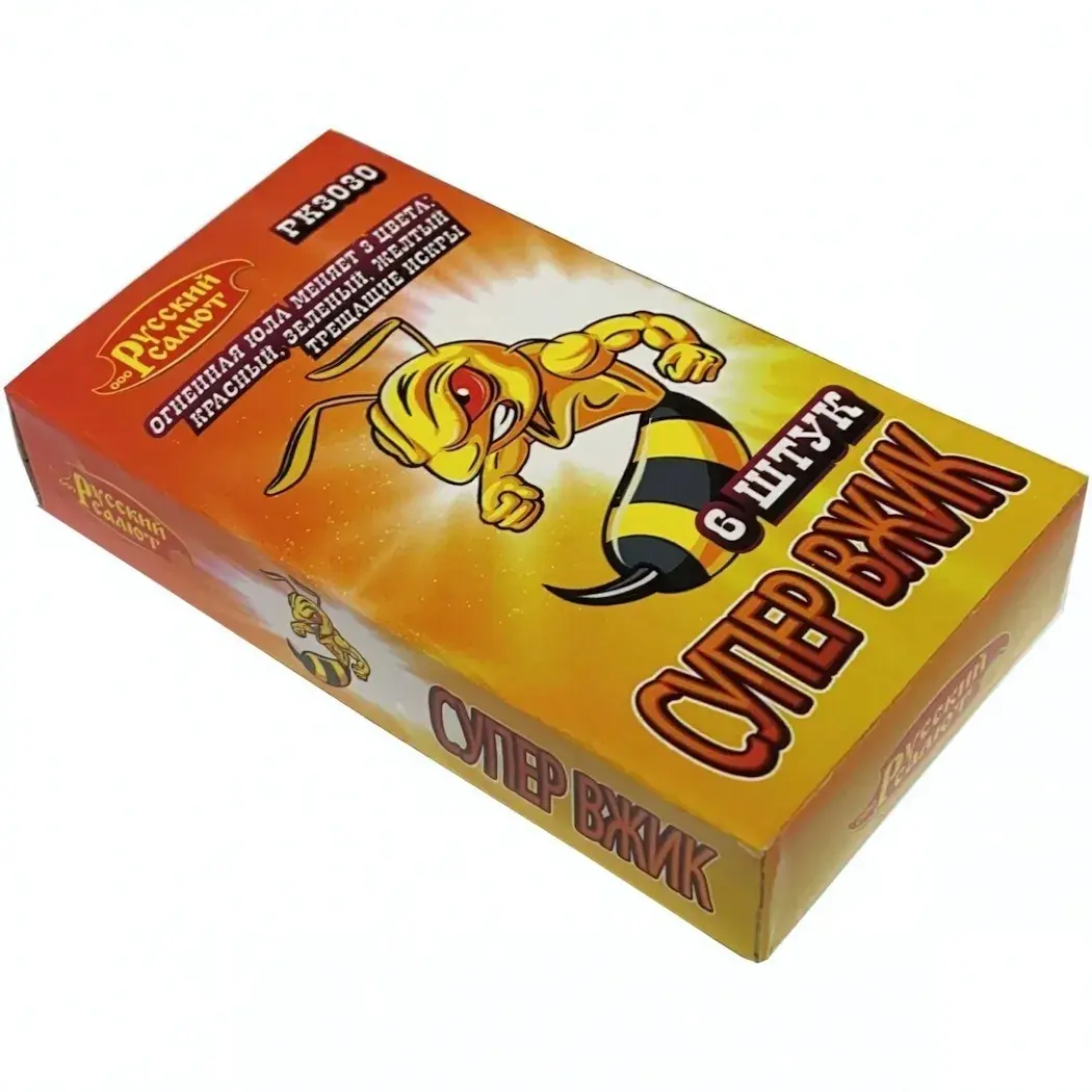 Фейерверк «Супер Вжик» имеет размеры 20/12/6, что делает его компактным и удобным для транспортировки. Упаковка выполнена в ярких оранжевых и желтых тонах с изображением динамичного cartoon-персонажа, что делает его привлекательным для всех возрастов. Не упустите возможность сделать ваш праздник незабываемым с фейерверком «Супер Вжик»!