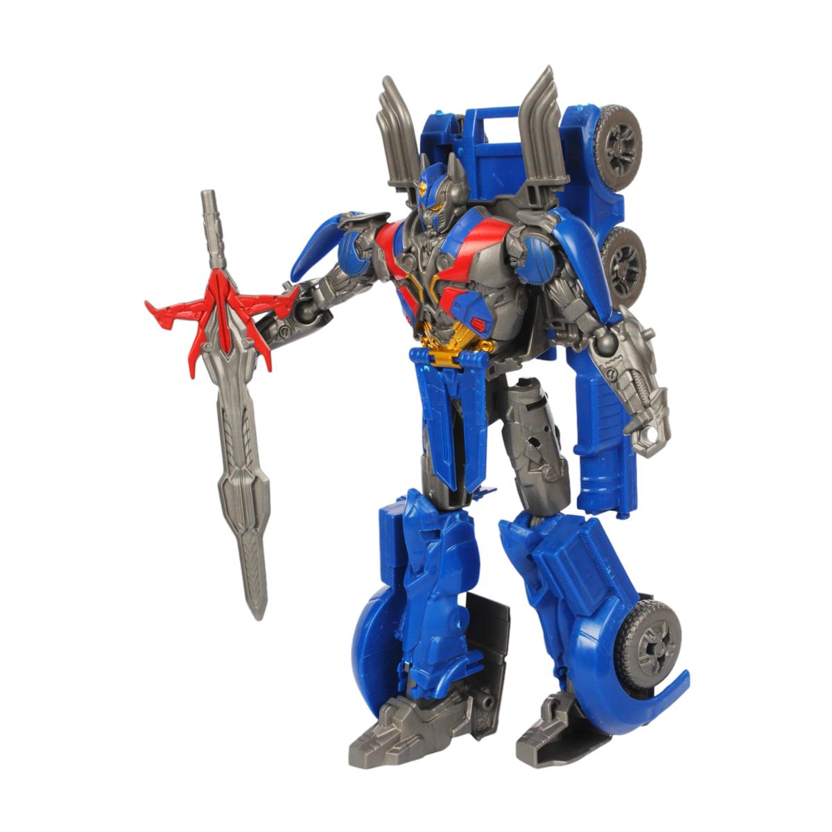 Робот легко трансформируется из боевой формы в машину, что позволяет детям развивать воображение и креативность. Игрушка подходит для активной игры и может стать отличным дополнением к коллекции трансформеров. В руках робота находится меч с серебристым лезвием, что добавляет элемент динамики и приключений в игру.