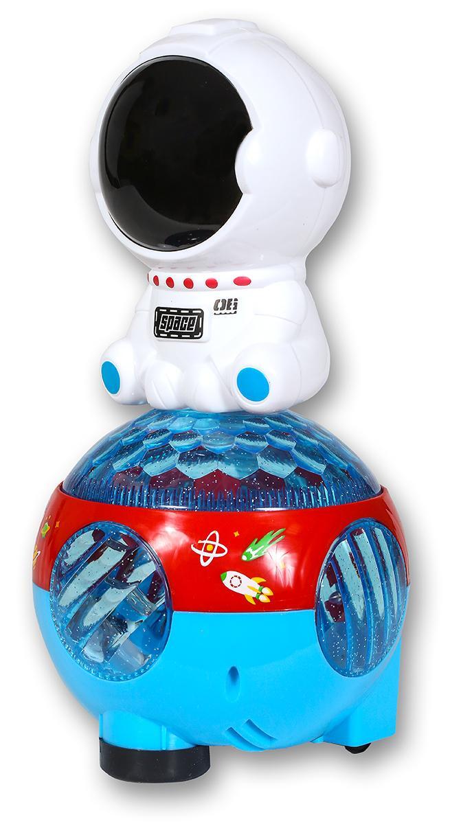 Стилизация под космонавта в скафандре с детализированными элементами: прозрачный шлем-проектор, светящиеся элементы на корпусе, тематические декоры с ракетами и звездами. Компактные размеры (14x13.8x21.5 см) позволяют разместить игрушку на тумбочке или полке.