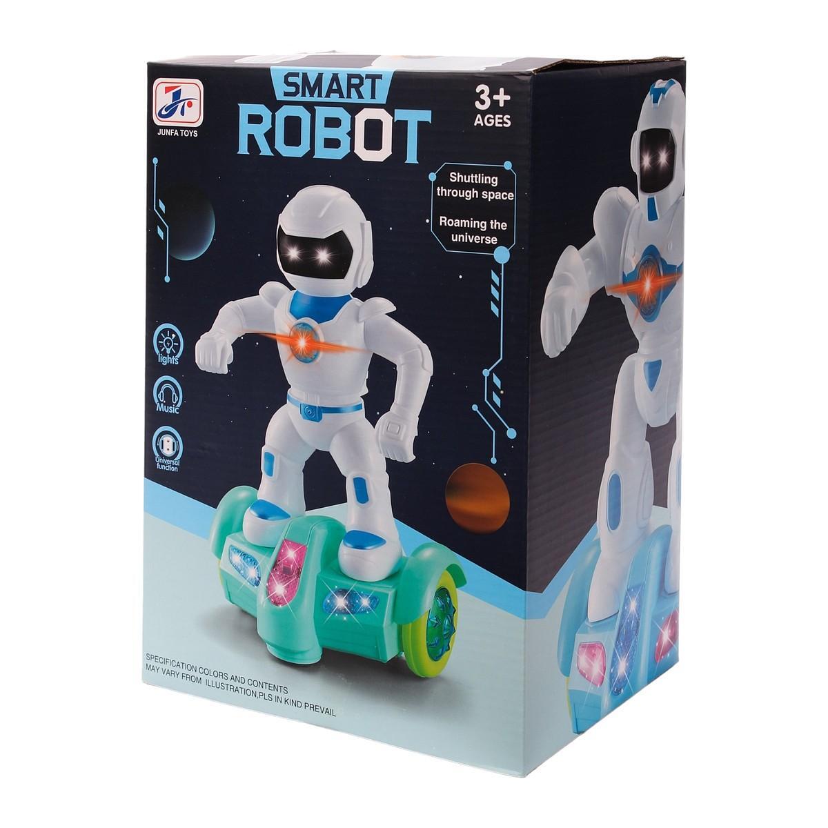 Размер упаковки составляет 20,0 * 29,0 * 15,0 см, что делает его удобным для хранения и транспортировки. Робот имеет черный визор, имитирующий лицо, и крупный светящийся элемент на груди, что добавляет ему индивидуальности. Платформа с колесами позволяет роботу легко передвигаться, а яркие цвета делают его заметным и привлекательным для детей.
