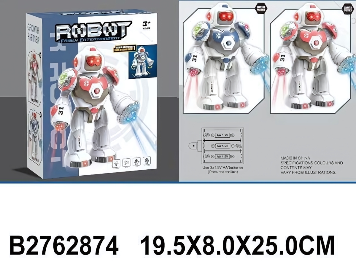Размер упаковки составляет 19,5 * 8,0 * 25,0 см, что делает его удобным для хранения и транспортировки. Робот выполнен из качественного пластика, что обеспечивает его долговечность и безопасность для детей. Обратите внимание, что элементы питания в комплект не входят, и для работы робота потребуются батарейки типа AA.