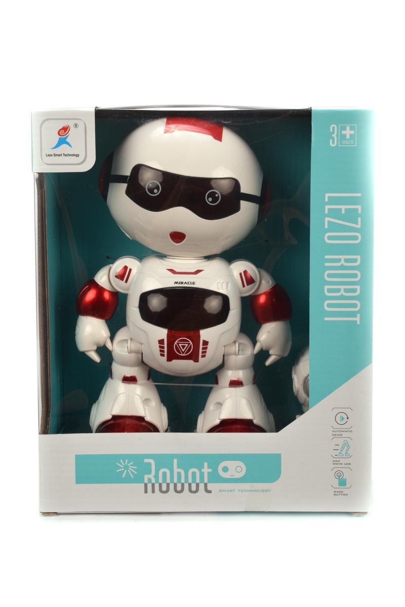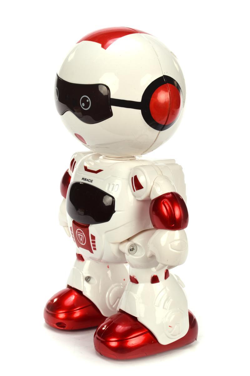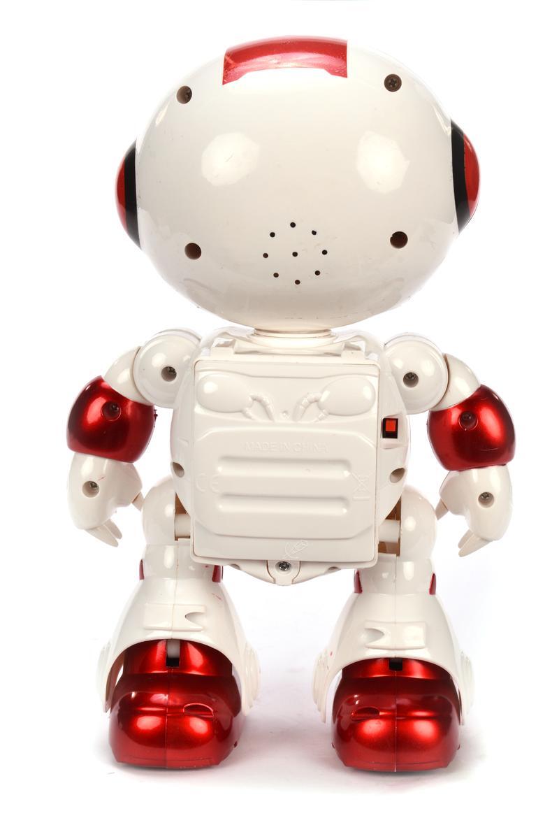 Робот изготовлен из качественного пластика с гладкими безопасными краями. Его яркий дизайн с элементами красного цвета и характерные "очки" на лице делают его особенно привлекательным для детей. Простое управление через пульт позволяет легко освоить игрушку даже самым маленьким пользователям.