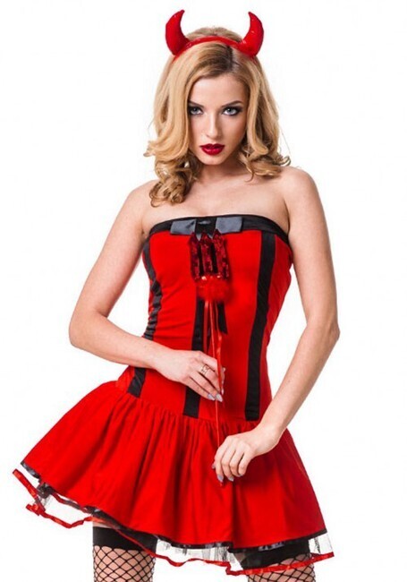 Костюм выполнен в красном цвете с черными элементами, что добавляет ему стильности. Платье имеет пышный крой и короткую длину, что делает его идеальным для демонстрации фигуры. Рожки и трезубец, входящие в комплект, дополняют образ и делают его завершенным. Не упустите возможность стать звездой вечеринки с этим великолепным костюмом!