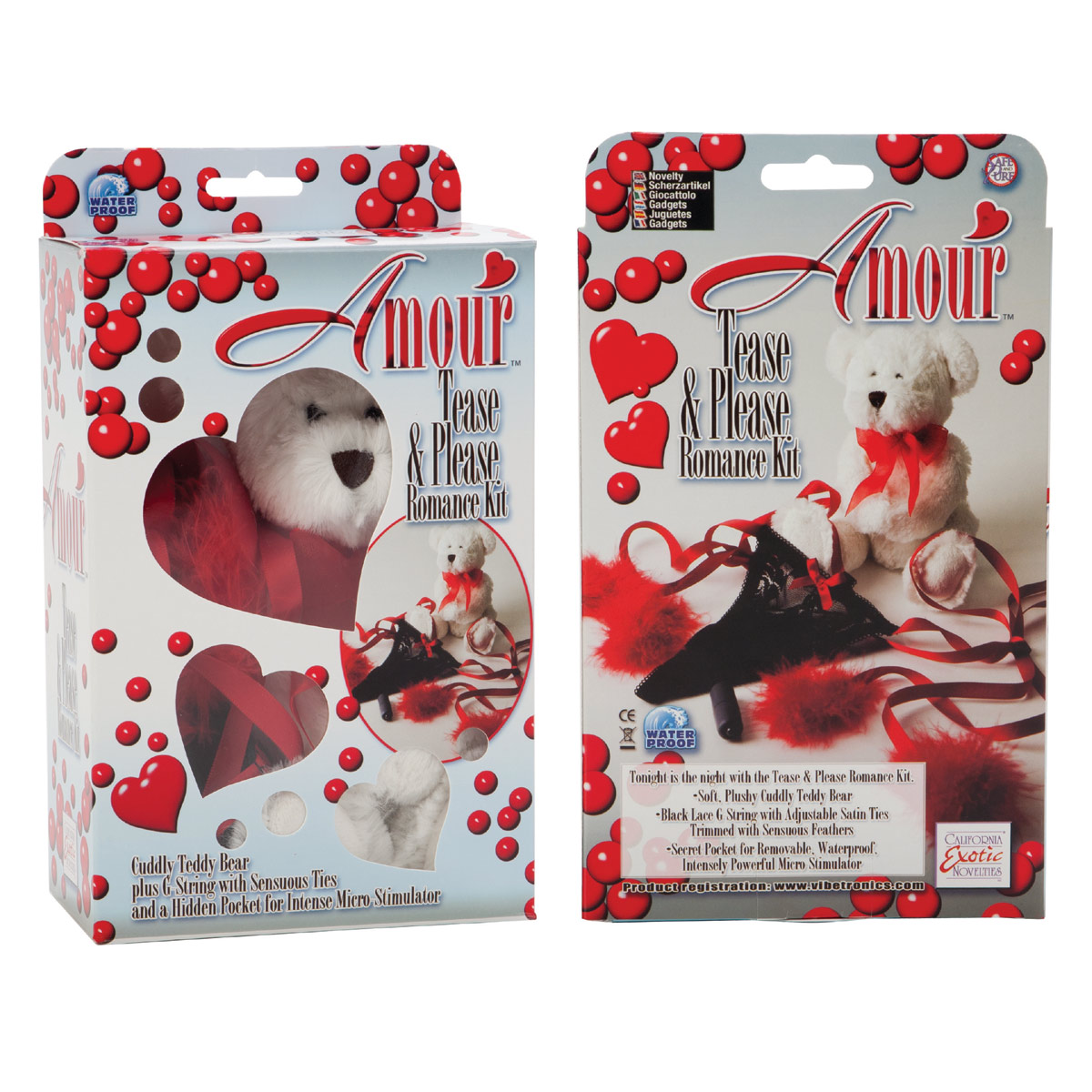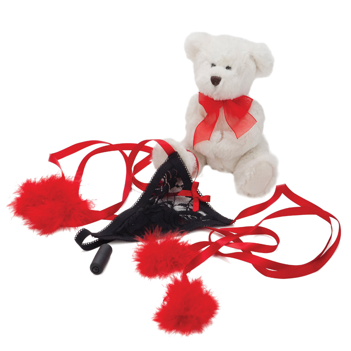 Набор "Amour Tease&Please" превращает обычную ночь в историю любви. Черные кружевные трусики-стринги с регулируемыми атласными лентами подчеркивают формы и дарят уверенность. Красные помпоны добавляют игривости, а белый плюшевый медвежонок становится символом нежности.