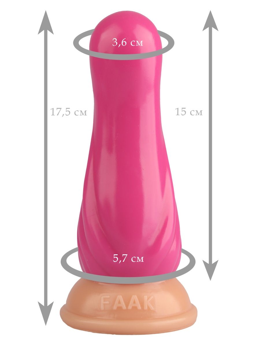 Общая длина изделия составляет 17,5 см. Рабочая (вводимая) часть имеет длину 15 см. Диаметр постепенно увеличивается от минимальных 3,6 см в области головки до 5,7 см в основании рельефной части. Такая геометрия обеспечивает плавное и контролируемое использование. Цвет изделия — насыщенный розовый, основание выполнено в телесном (бежевом) оттенке.