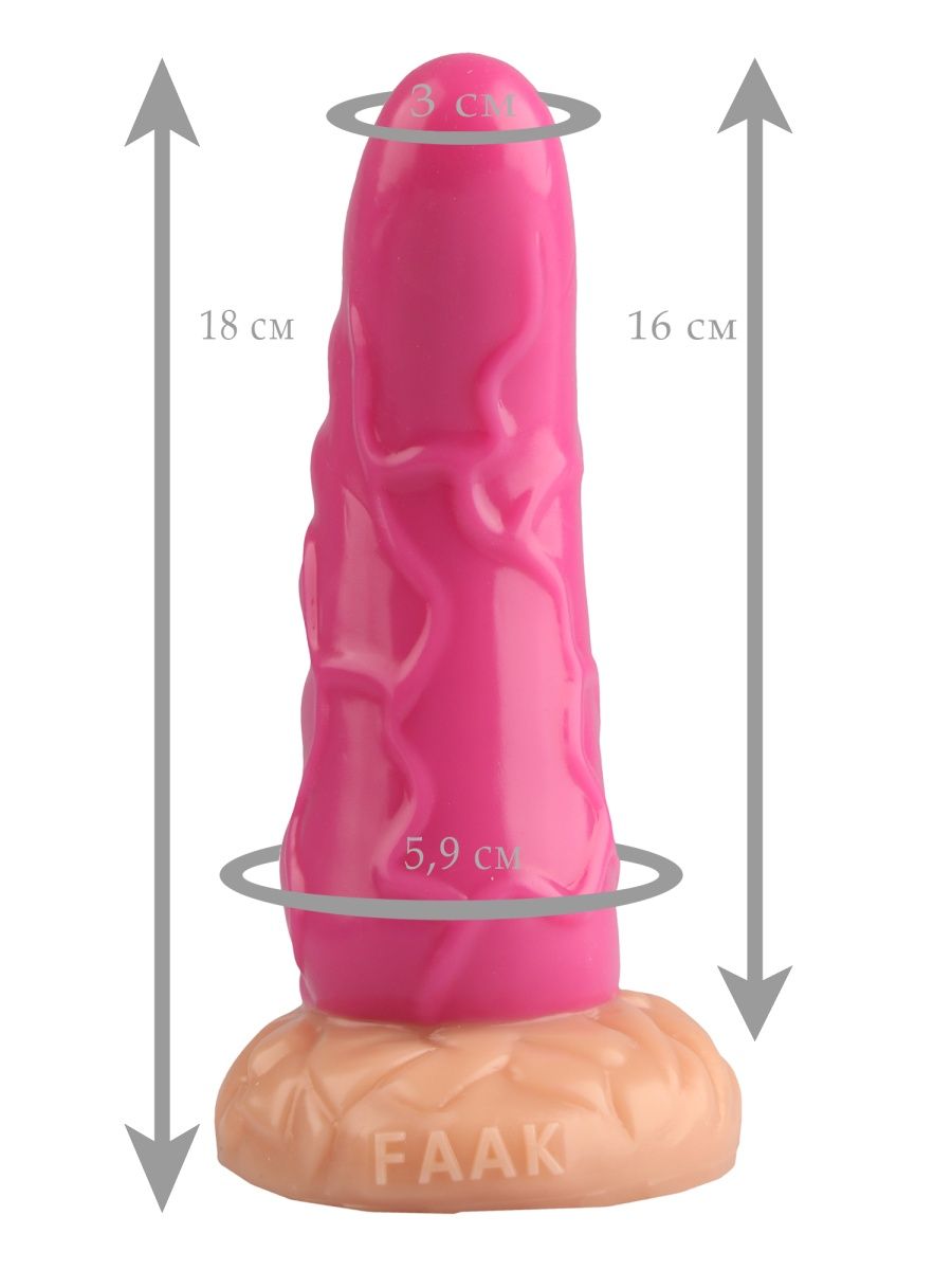 Общая длина изделия составляет 18 см, при этом рабочая (вводимая) часть имеет длину 16 см. Диаметр плавно увеличивается от минимальных 3 см у наконечника до 5.9 см в основании рабочей зоны. Такая геометрия позволяет постепенно адаптироваться к размерам. Цвет изделия — насыщенный розовый. На основании присутствует рельефная надпись «FAAK».