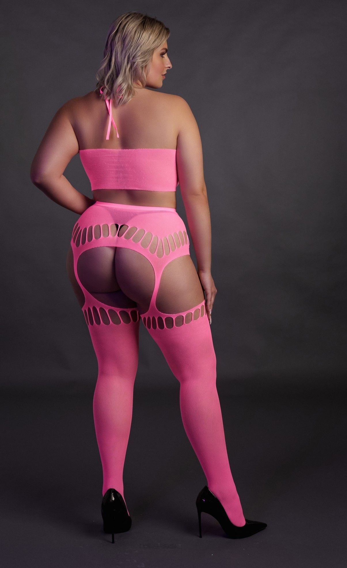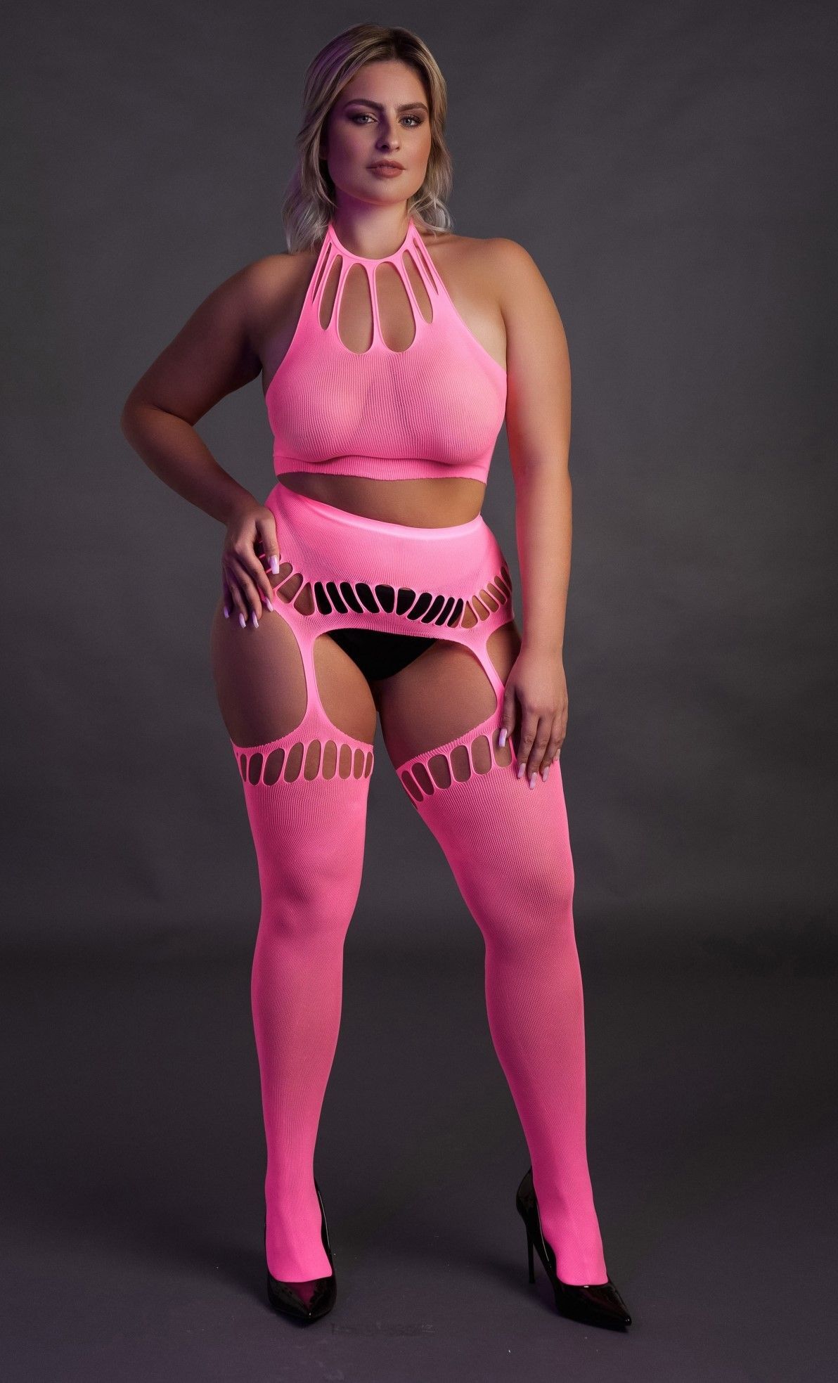 Погрузитесь в мир соблазна и уверенности с нашим розовым неоновым комплектом белья Ouch! Этот комплект, состоящий из топа и пояса с чулками, создан для того, чтобы подчеркнуть ваши достоинства и скрыть недостатки. Изготовленный из плотной сетки с сексуальным узором, он идеально подходит как для романтических вечеров, так и для смелых выходов в свет.