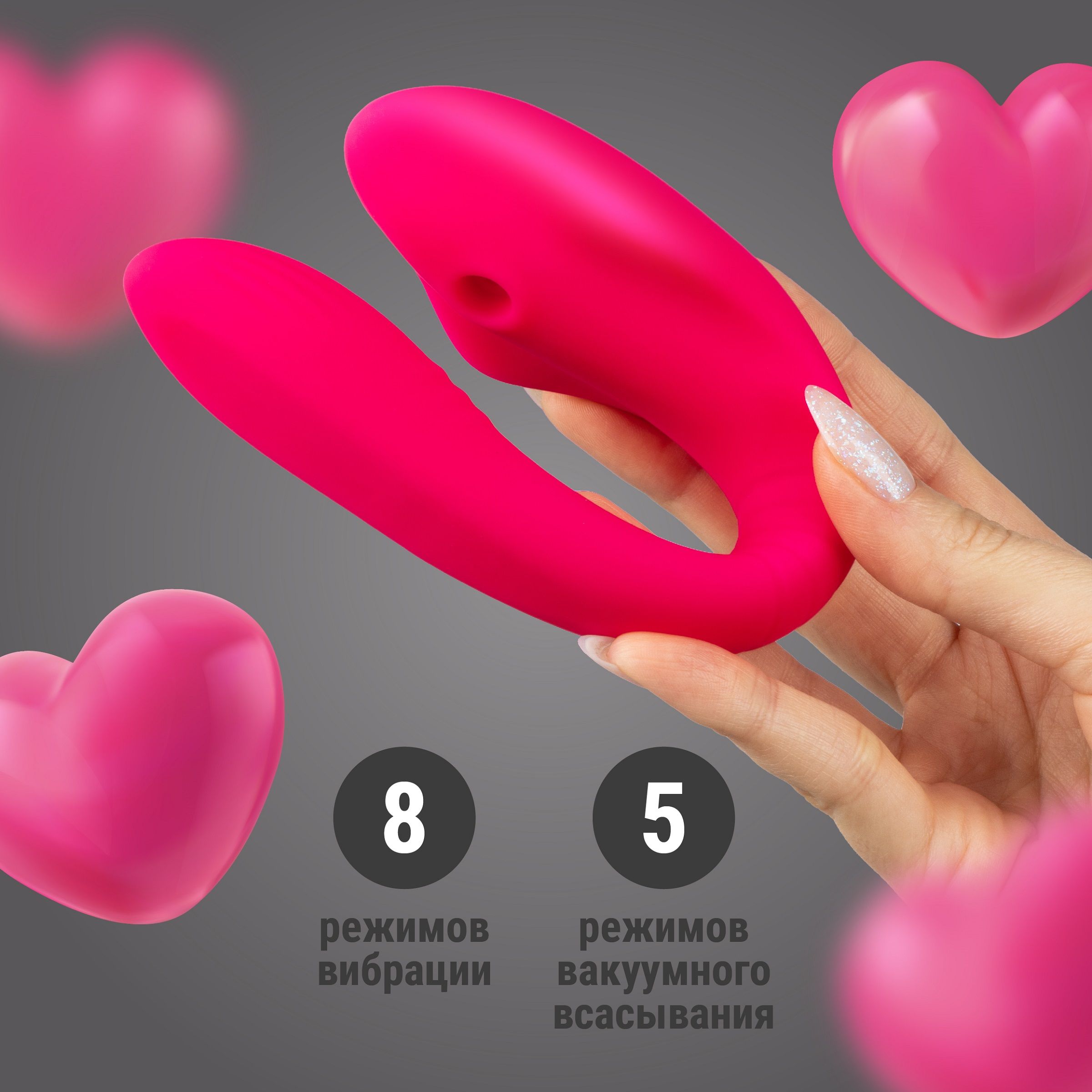 Розовый U-образный вибростимулятор «fairy land» одновременно воздействует на две чувствительные зоны: вакуумный конец обнимает клитор, а вибрирующий стимулирует точку G. 8 режимов вибрации и 5 режимов вакуумного всасывания позволяют подобрать именно ваш ритм — от медленного сведения с ума до мощного финала.