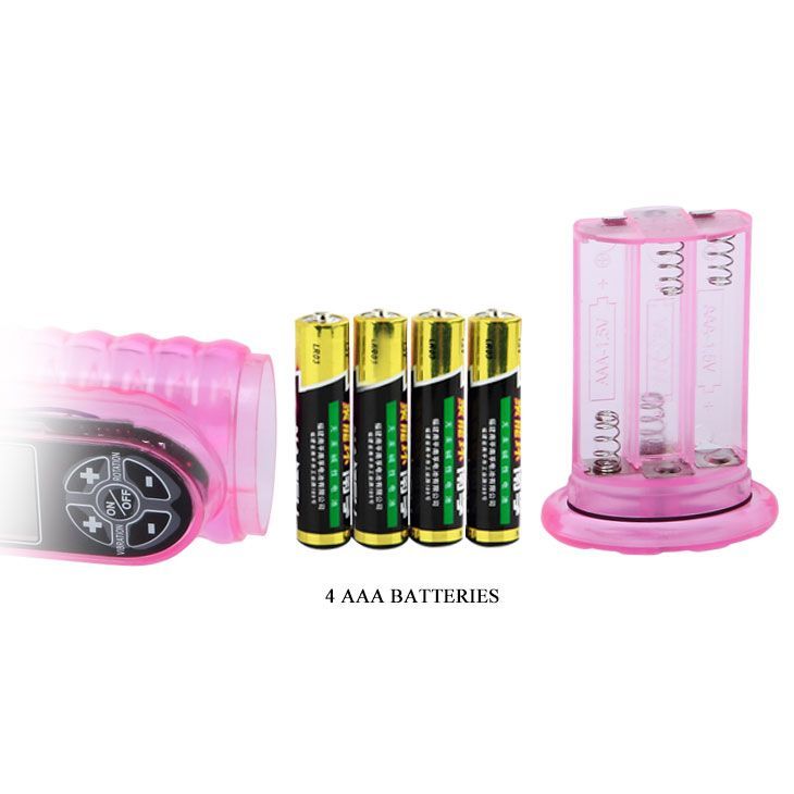 Общая длина вибратора составляет 26,5 см, диаметр основного стержня — 4 см. Для работы требуются 4 батарейки типа AAA (в комплект не входят). Полупрозрачный розовый корпус придает игрушке эстетичный и современный вид.