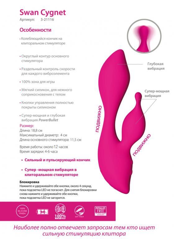 Позвольте изящному "Лебедю" (именно так переводится "Swan") подарить вам незабываемое путешествие к новым вершинам удовольствия. Его сдержанный дизайн и мощный функционал созданы для того, чтобы каждая встреча с ним была особенной.