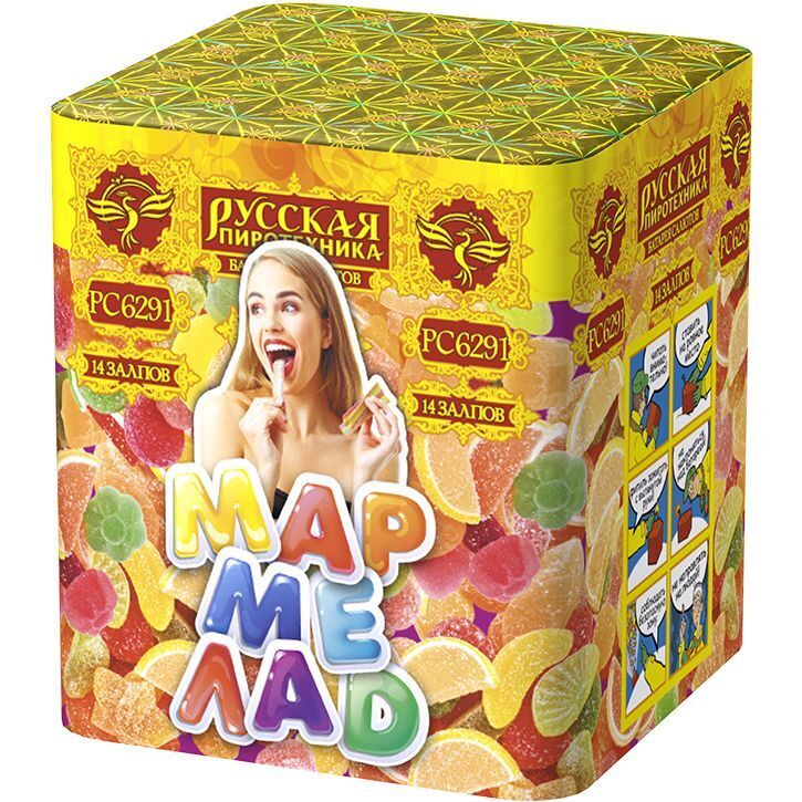 Салют имеет размер 0,9" х 14, что делает его компактным и удобным для транспортировки. Упаковка выполнена в ярко-желтых тонах с изображениями фруктовых мармеладов, что добавляет праздничного настроения. Не упустите возможность сделать ваш праздник ярче с салютом «Мармелад»!