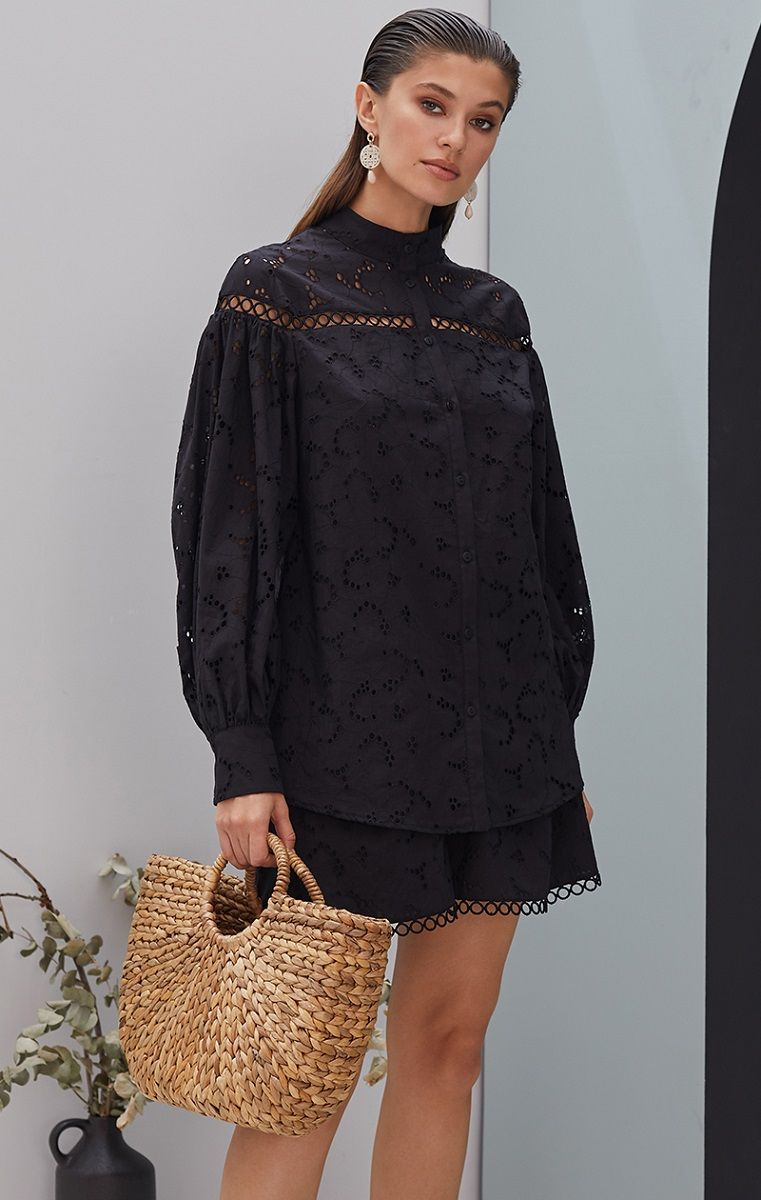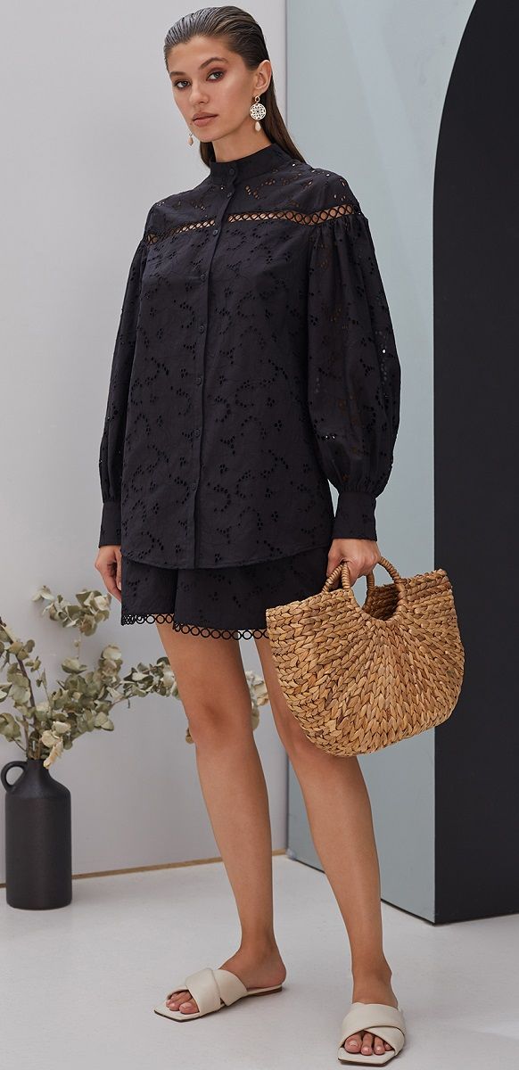 Особенности: свободный крой, объемные рукава с манжетами на пуговицах, ажурные декоративные вставки, воротник-стойка, застежка на пуговицы спереди.