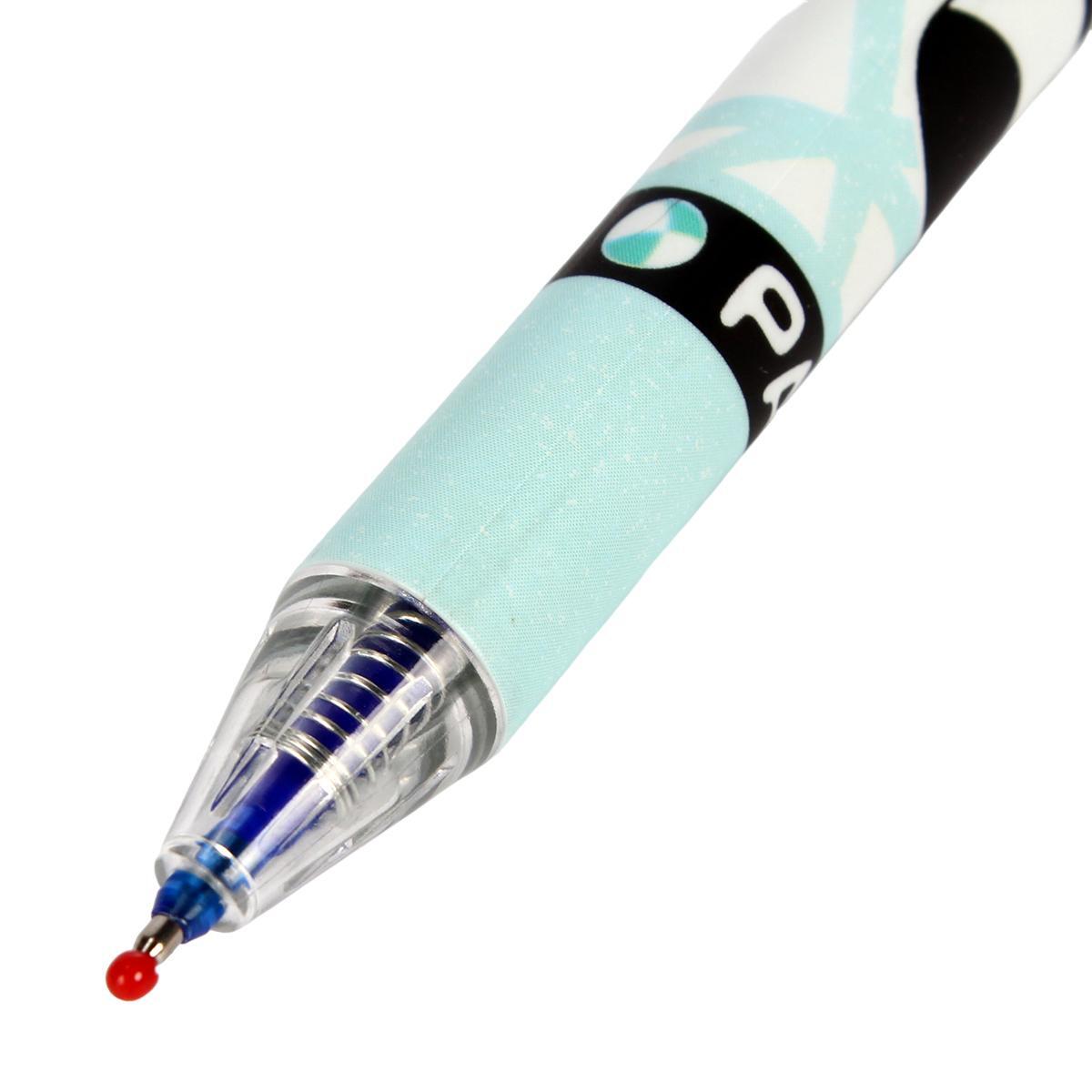 Ручка представлена в светло-голубом цвете с элементами белого и черного на декоре. Упакована в пластиковую коробочку по 12 штук, что удобно для хранения и транспортировки. Размеры ручки идеально подходят для комфортного письма, а её стильный внешний вид добавляет индивидуальности вашему канцелярскому набору.