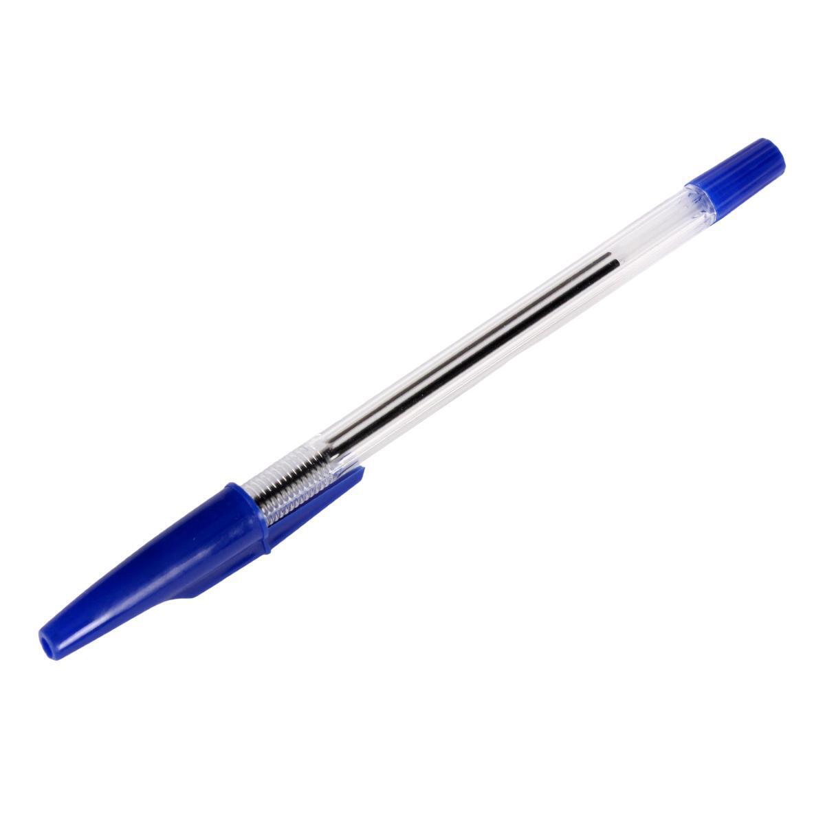 Шариковая ручка с прозрачным корпусом и синим колпачком сочетает практичность и эргономику. Удобный клип позволяет надежно крепить ее на кармане или тетради, а металлический наконечник обеспечивает плавное скольжение по бумаге.