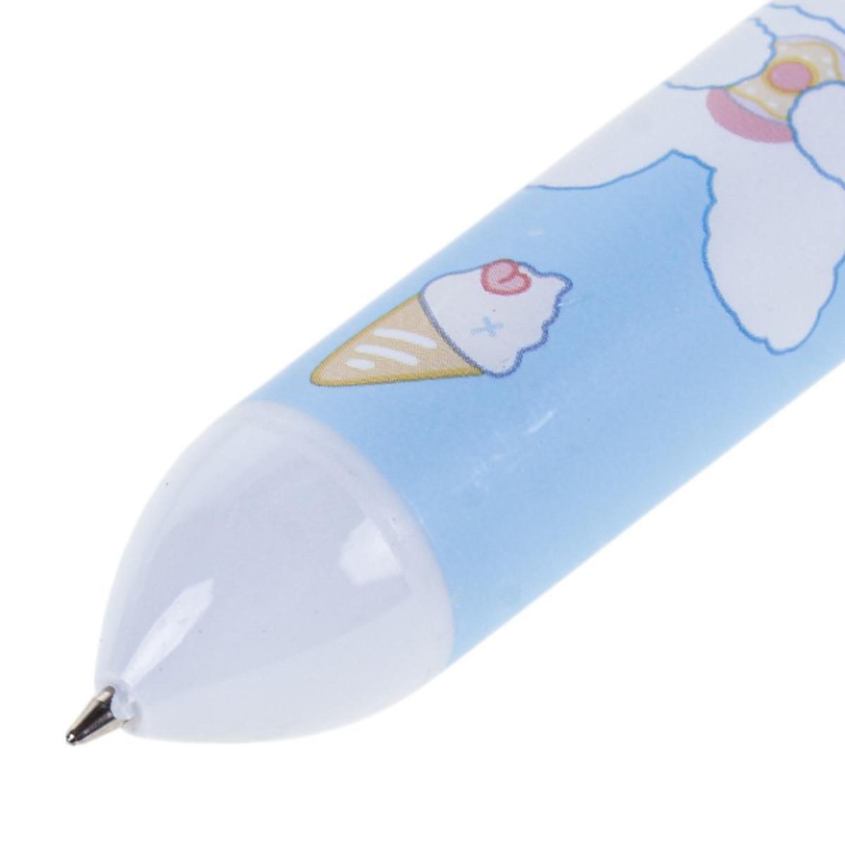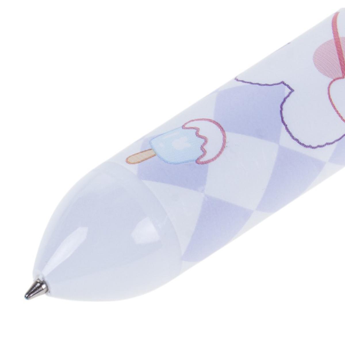 В ассортименте представлено 4 вида ручек: фиолетовая с квадратным узором, розовая с медвежонком и фотоаппаратом, голубая с мороженым и желтая с напитком и тортиком. Каждая ручка имеет округлую форму и белый носик, что делает ее удобной для захвата. Яркие цвета и игривые изображения делают эту ручку идеальным подарком для детей.