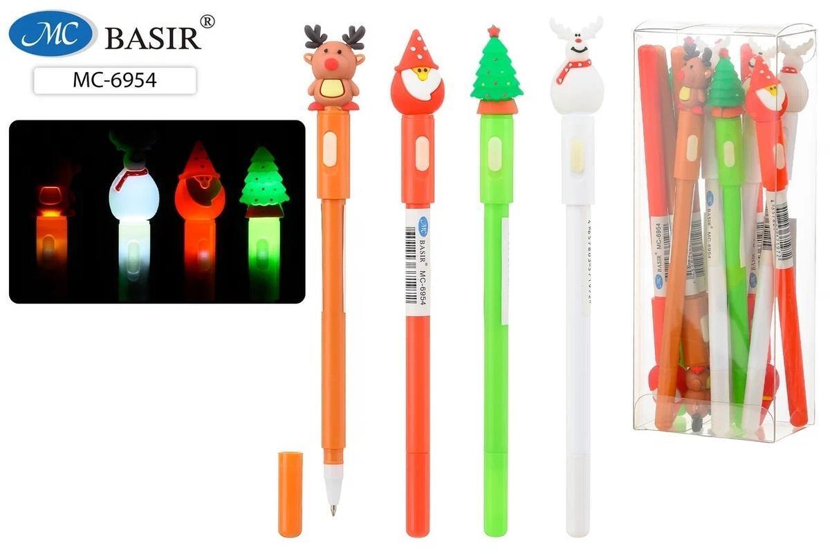 Ручка шариковая синяя "Новогодние-5", фонарик-брелок: Дед Мороз, ёлка, олень