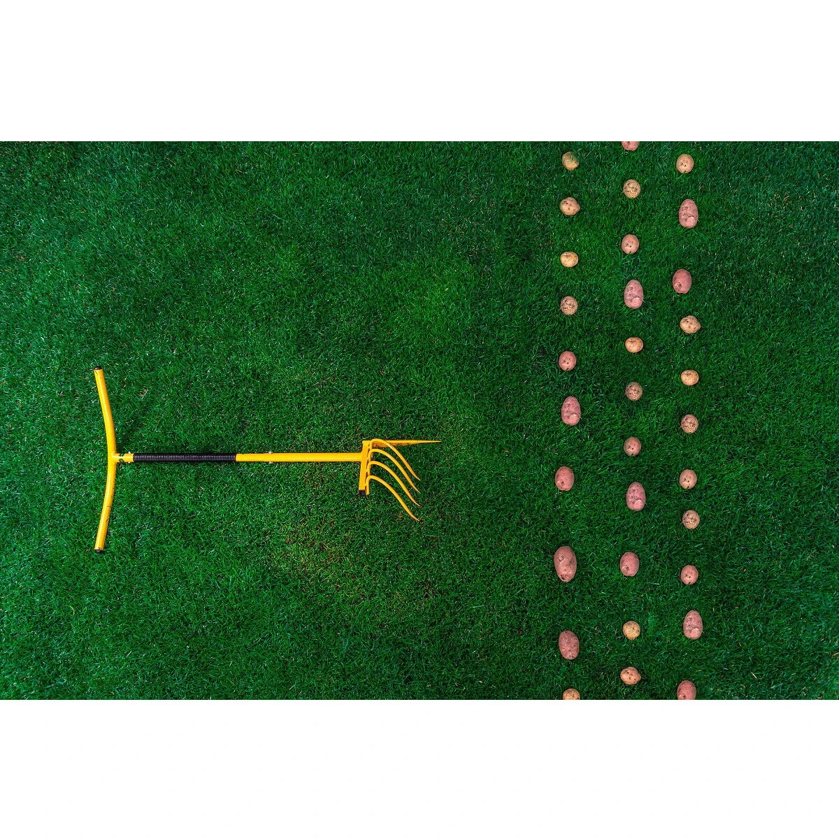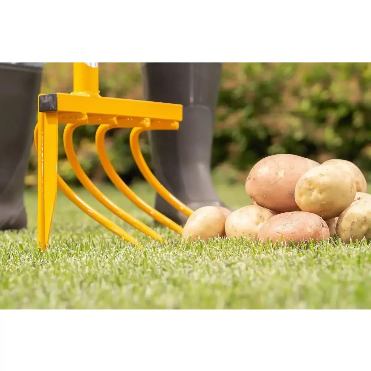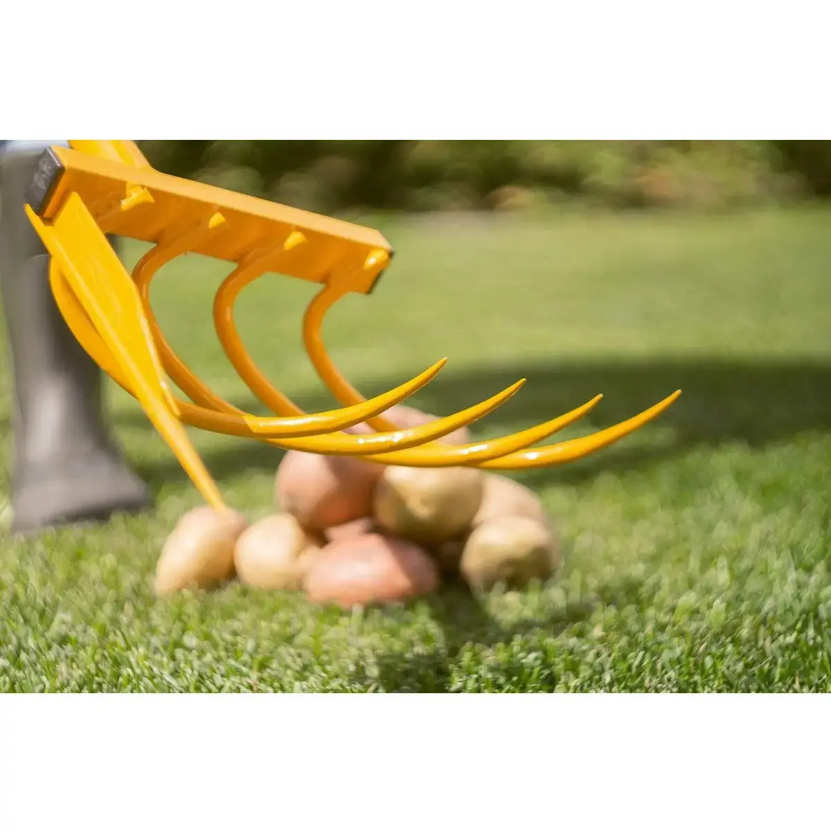 Просто установите инструмент вертикально рядом с кустом, проверните вокруг оси — зубья аккуратно поднимут клубни на поверхность, не повреждая их. Больше не нужно наклоняться или прикладывать силу: уникальная изогнутая форма ручки передаёт усилие от движения бёдер прямо в рабочую зону.