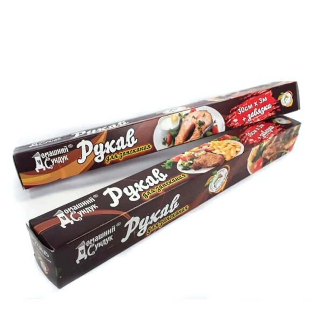 Рукав изготовлен из высококачественного термостойкого материала, который выдерживает высокие температуры. Его размеры – 30 см в ширину и 3 м в длину – позволяют использовать его для различных блюд, от запеченной рыбы до овощных рагу. Упаковка оформлена в коричневых тонах с яркими надписями, что делает ее привлекательной и заметной на кухне.
