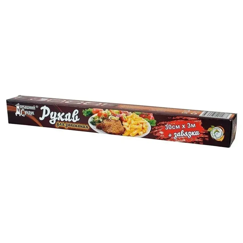 Рукав для запекания от бренда «Домашний Сундук» сохраняет натуральный вкус продуктов и сокращает время приготовления. Прочная термостойкая пленка равномерно распределяет жар, а встроенные завязки фиксируют содержимое без протеканий.