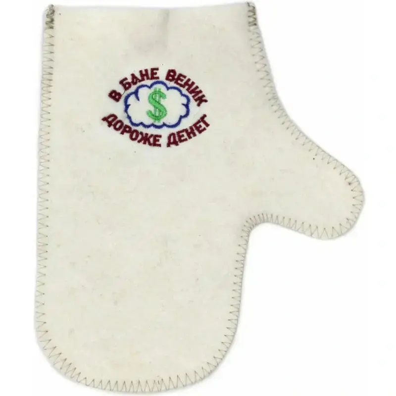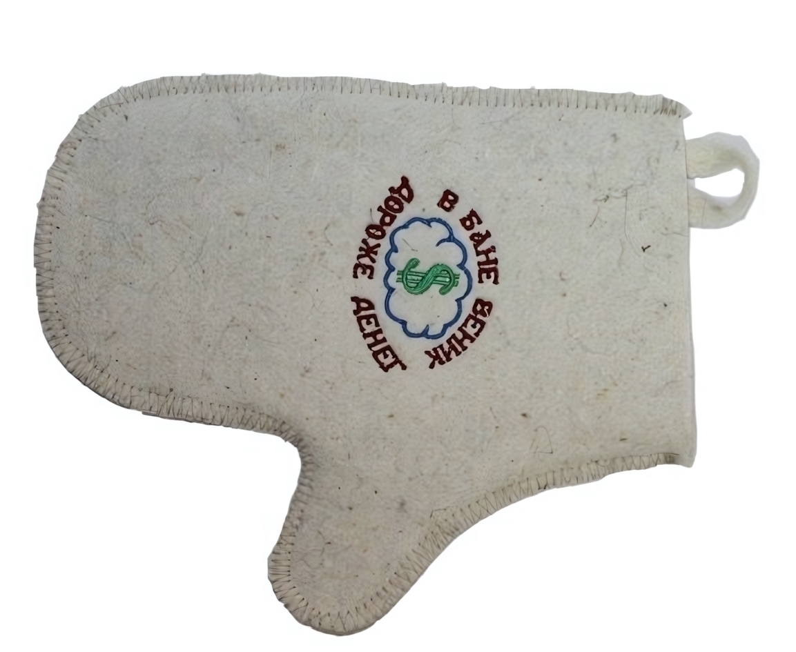 Почему стоит выбрать именно эту рукавицу? Во-первых, она выполнена из высококачественного материала, который обеспечивает долговечность и практичность. Во-вторых, яркая вышивка с надписью «В бане веник дороже денег» и изображением облака с символом доллара добавляет изделию уникальности и стиля. Это не просто аксессуар, а элемент, который подчеркнет вашу любовь к банным традициям.