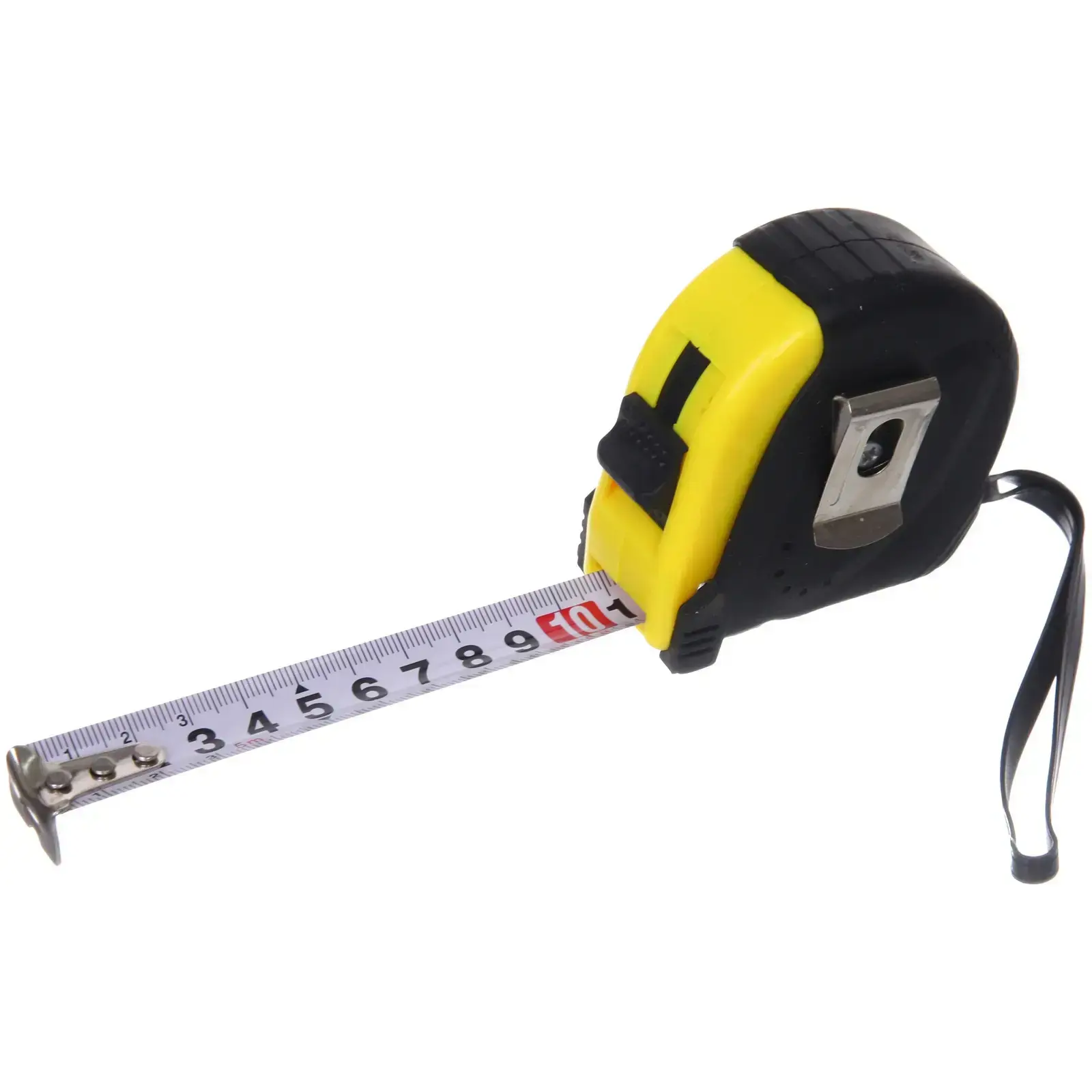Рулетка выполнена из качественных материалов: корпус из прочного пластика с резиновыми вставками, что обеспечивает надежный захват. Лента рулетки имеет четкую разметку в сантиметрах и дюймах, что делает её использование интуитивно понятным. Размеры и вес рулетки позволяют легко носить её с собой, а стильный черно-желтый дизайн добавляет эстетики вашему инструменту.