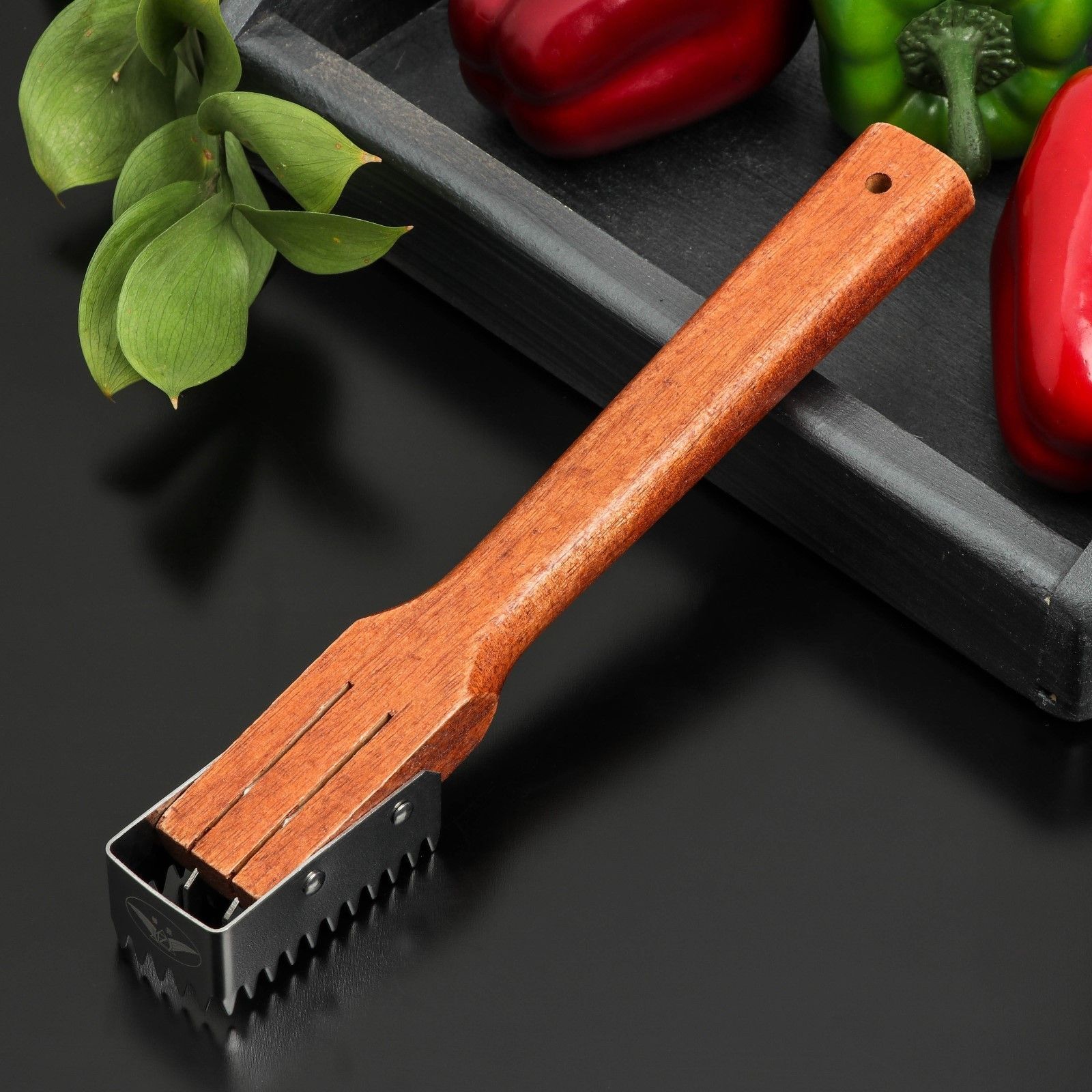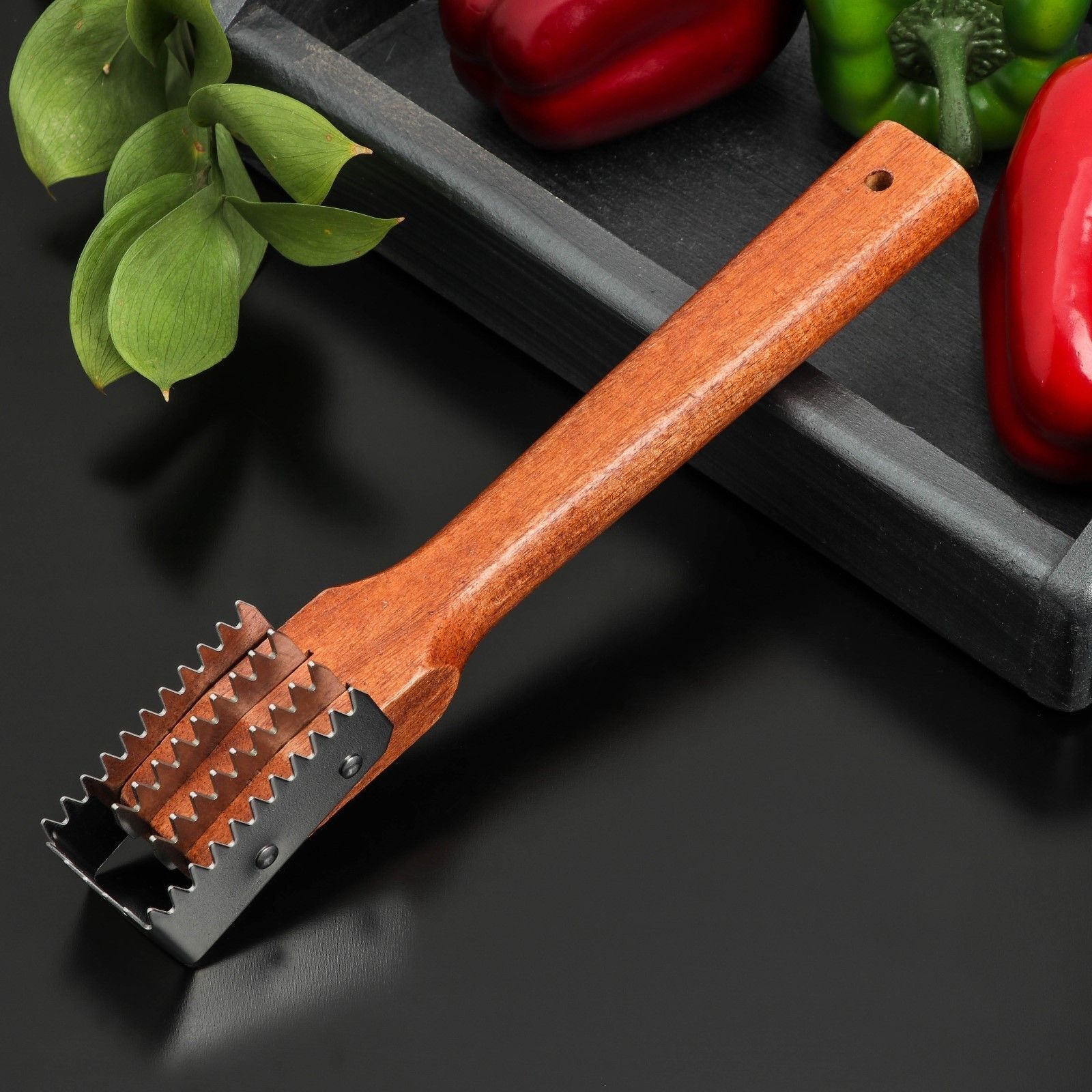 Инструмент имеет удобную деревянную ручку, которая обеспечивает надежный захват и комфорт при использовании. Рыбочистка подходит как для профессиональных поваров, так и для домашних кулинаров. Благодаря своей конструкции, она позволяет эффективно обрабатывать рыбу, сохраняя при этом её целостность.