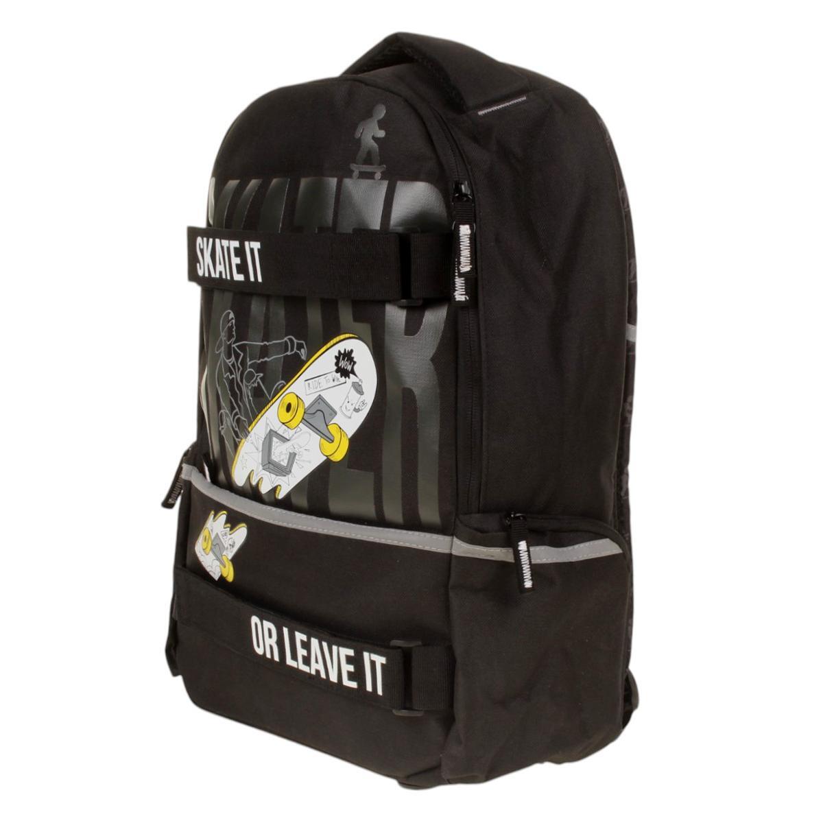 Водоотталкивающий полиэстер защищает содержимое от дождя, а усиленное дно сохраняет форму рюкзака. Сублимационная печать гарантирует стойкость рисунка — принт со скейтбордической тематикой не выцветет после стирок.