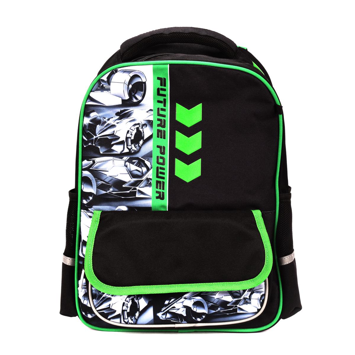 Рюкзак школьный "Футуристичные тачки", 28х37.5х13.5см, жесткая спинка, черный с зеленым