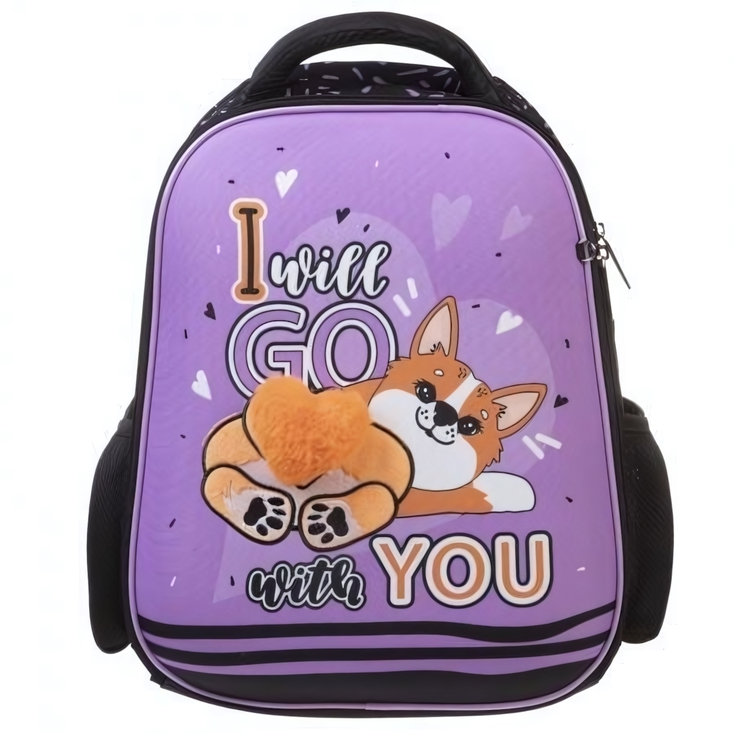 Фиолетовый рюкзак с очаровательным корги и мотивирующей надписью «I will GO with YOU» станет любимым аксессуаром. Объёмные 3D-элементы (пушистый хвост и большие глаза собаки) создают эффект объёмного рисунка.