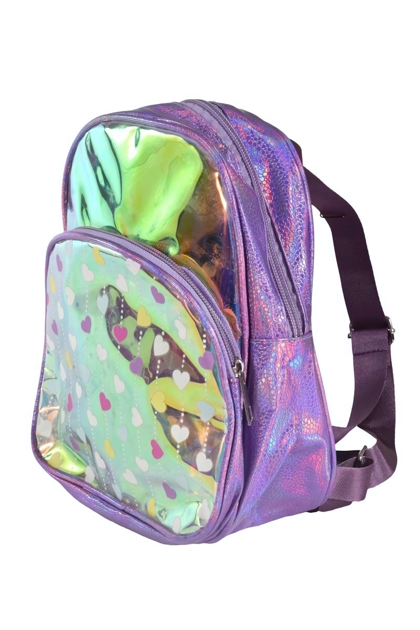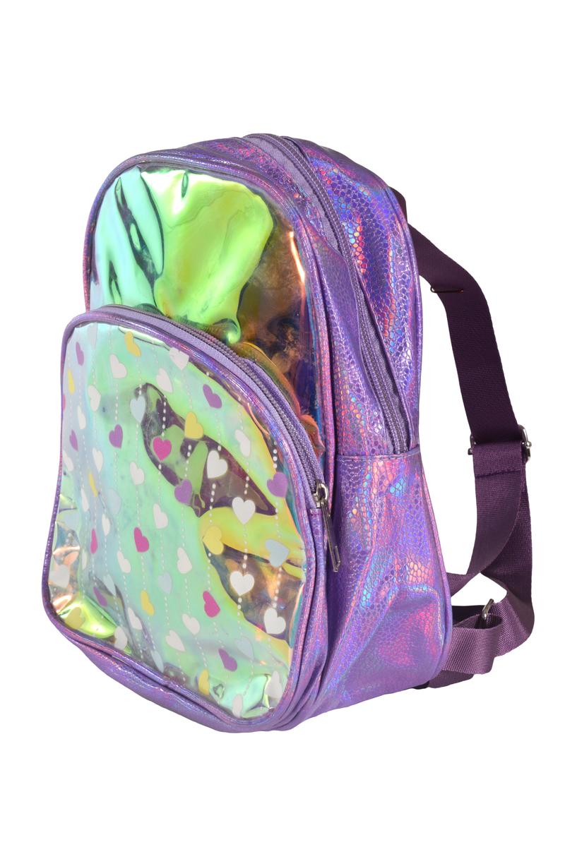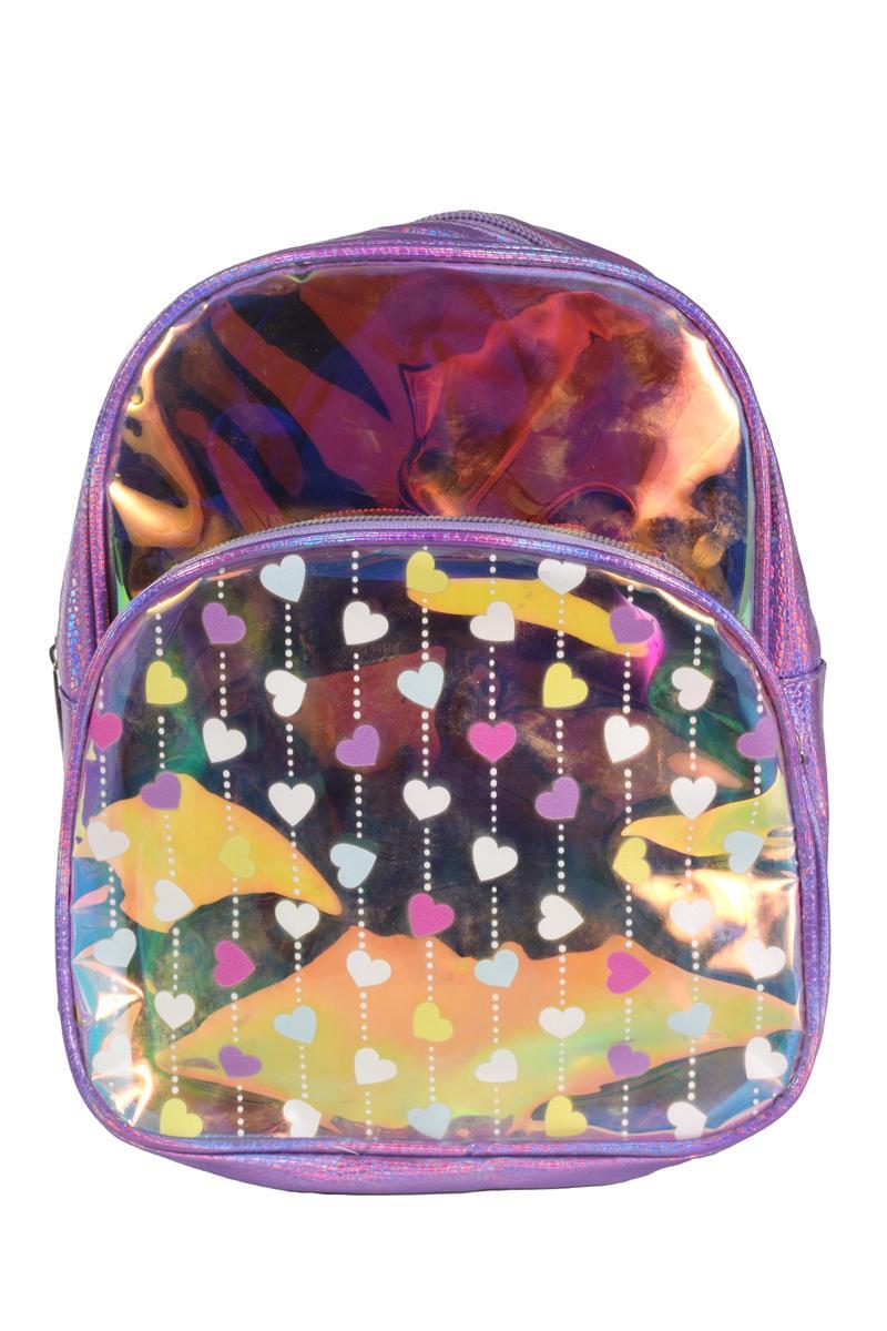 - Прозрачная вставка: Передняя часть рюкзака выполнена из прозрачного материала с разноцветными сердечками, что добавляет оригинальности.