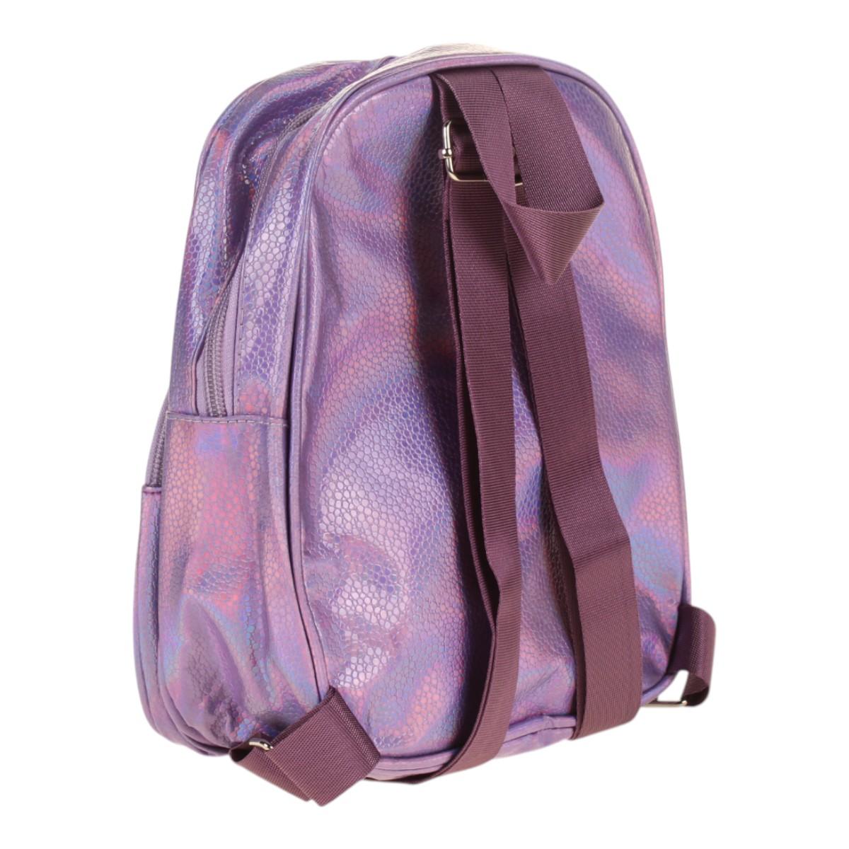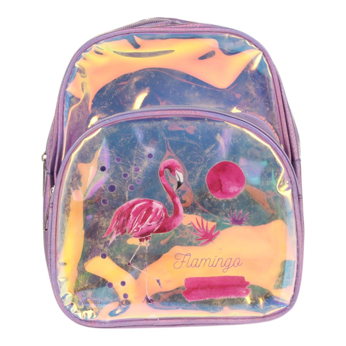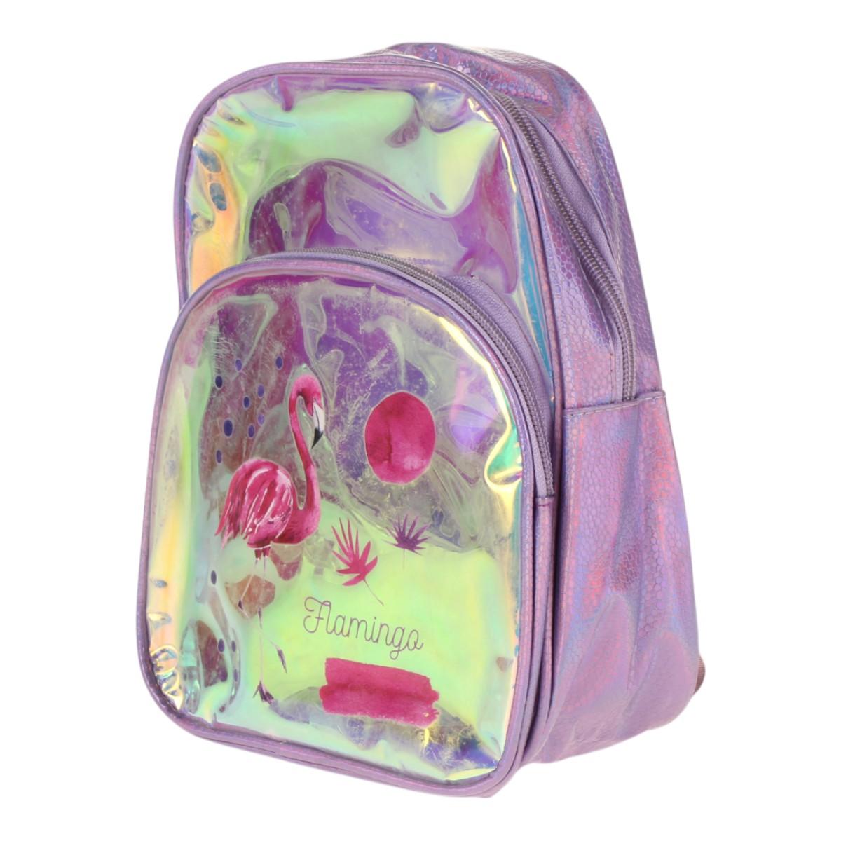 Рюкзак детский фиолетовый с фламинго, блестящий, 2 отделения, 23х18х5см