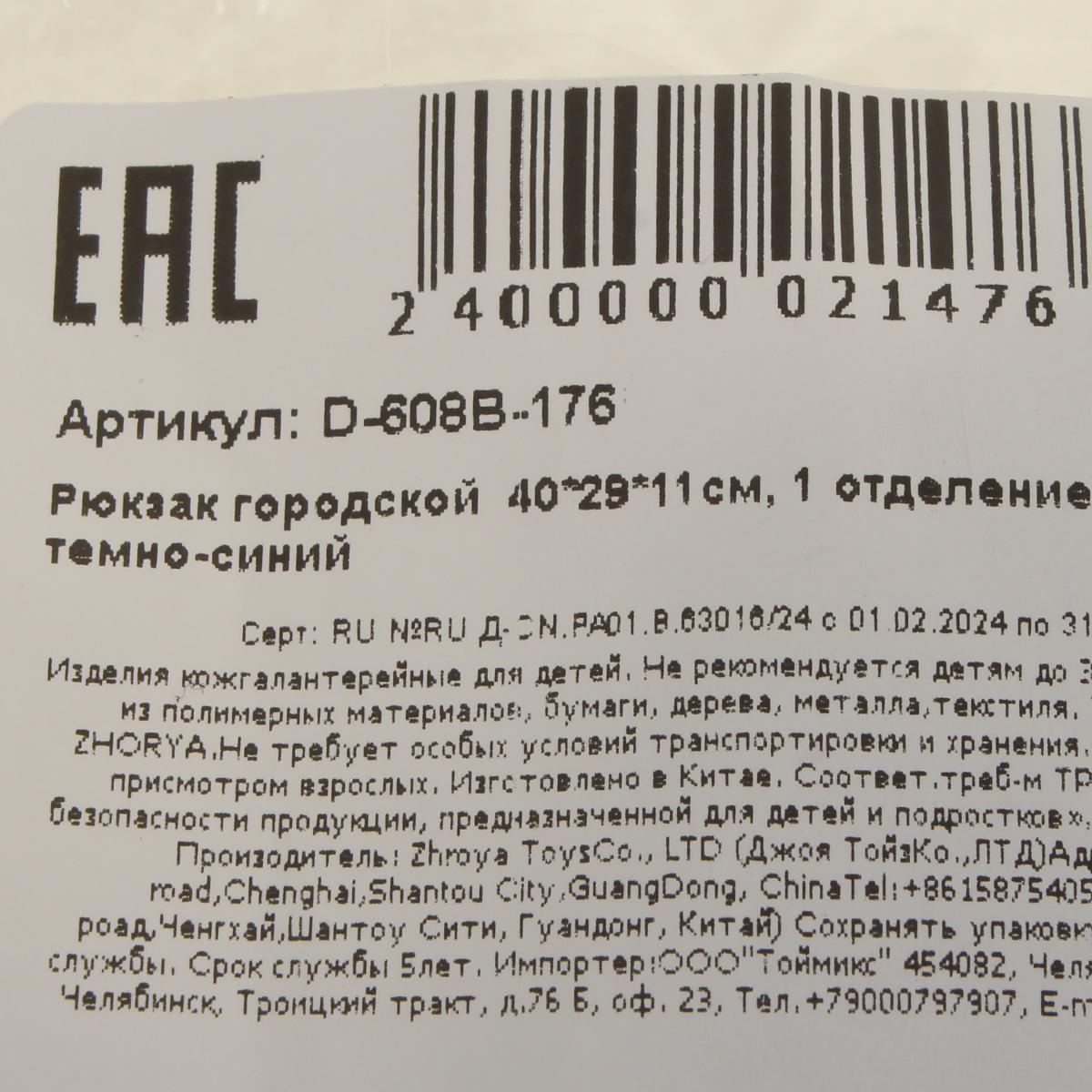 Рюкзак городской темно-синий, 40х29х11см, 1 отделение + карман, нейлон, регулируемые лямки