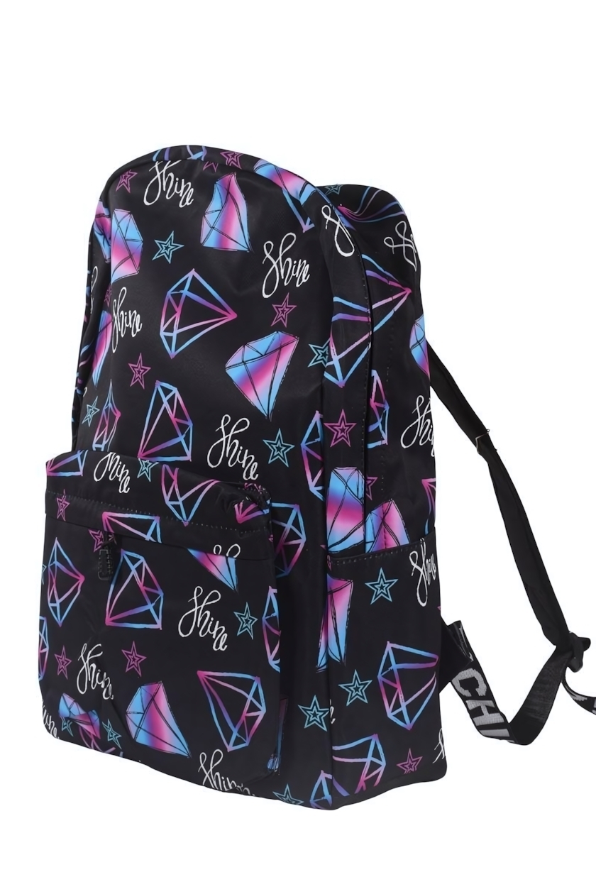 Рюкзак с геометрическим принтом в модной палитре — идеальный выбор для тех, кто ценит практичность и самовыражение. Уникальный дизайн с переливающимися кристаллами и надписью «Shine» подчеркнет вашу индивидуальность в школе, университете или городских прогулках.