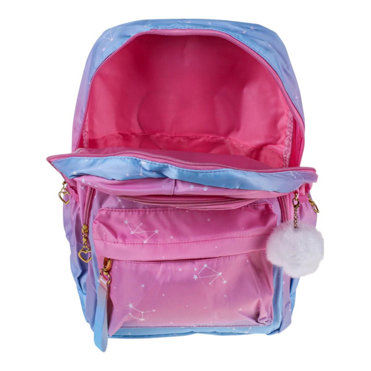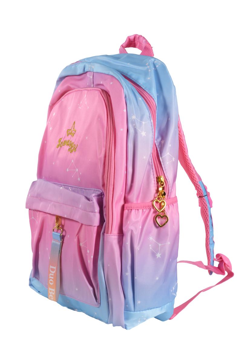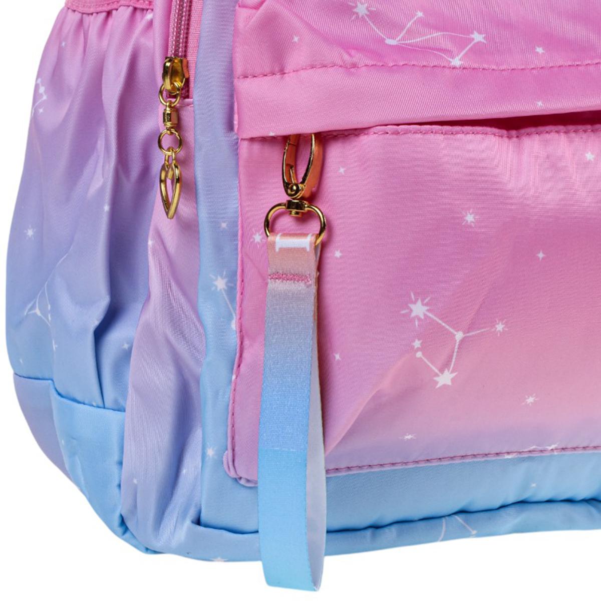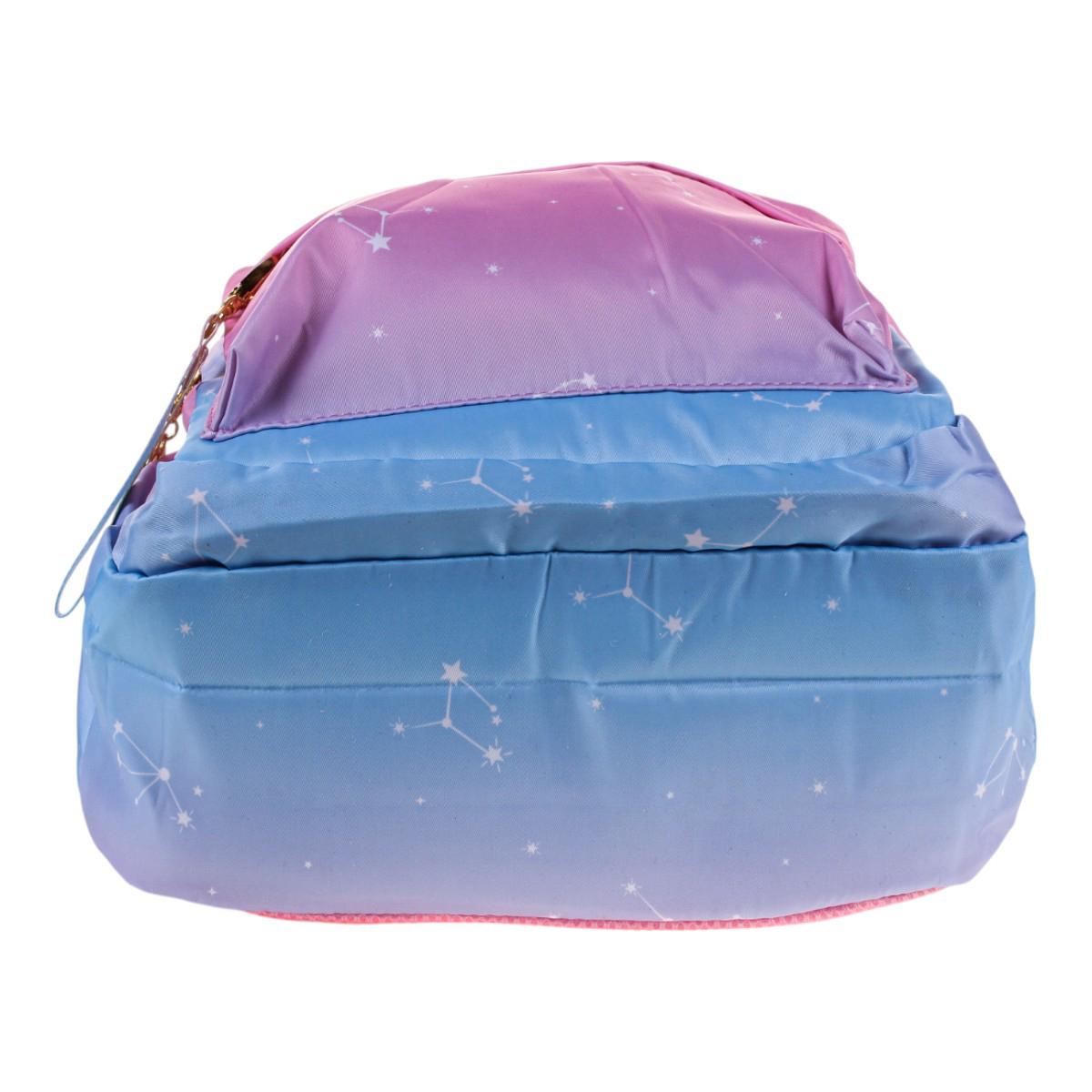 Этот рюкзак станет вашим идеальным спутником на каждый день. Его элегантная градиентная окраска от нежно-розового до глубокого голубого сочетается с ультрамодными элементами: золотистыми акцентами и вышивкой в виде звезд.