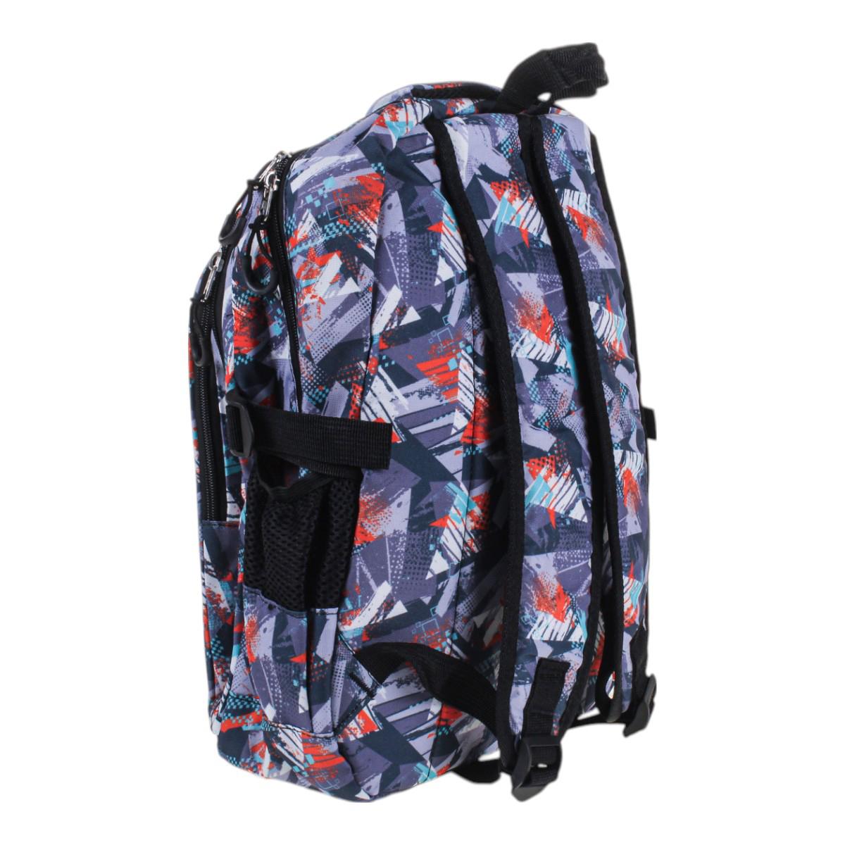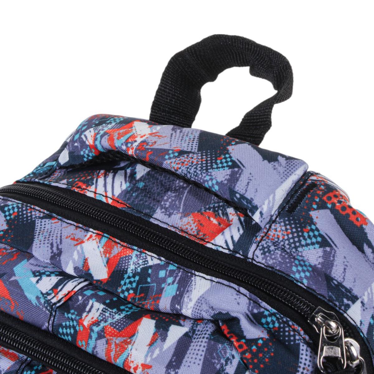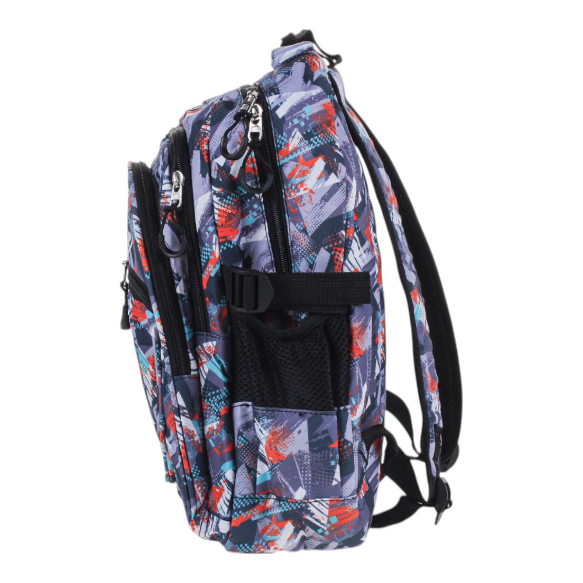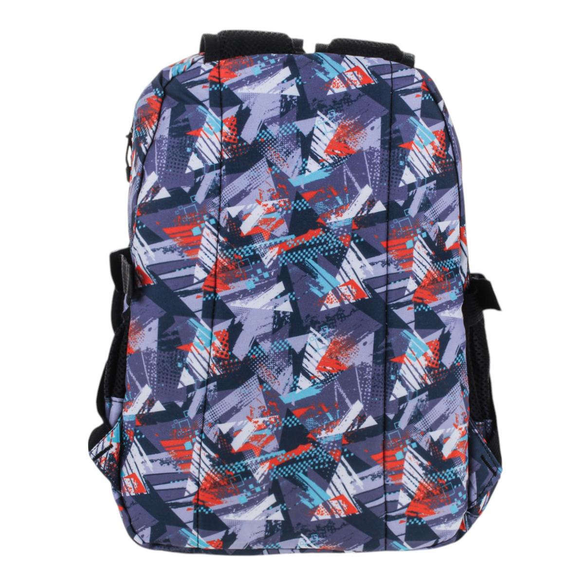 Рюкзак изготовлен из прочного текстиля, устойчивого к износу. Мягкие регулируемые лямки обеспечивают комфорт даже при длительном ношении. Абстрактный принт в серых, синих и красных тонах делает модель универсальной и стильной.