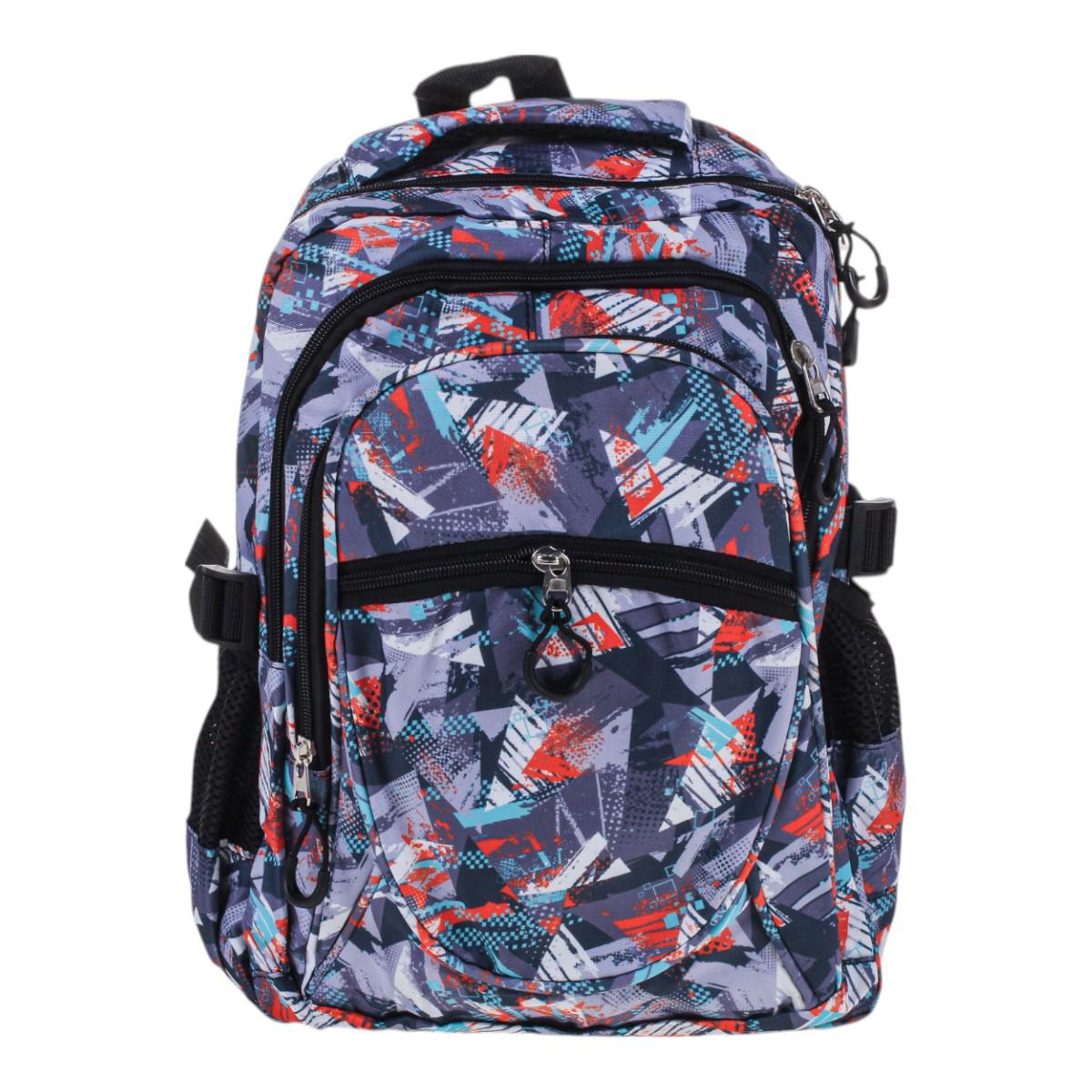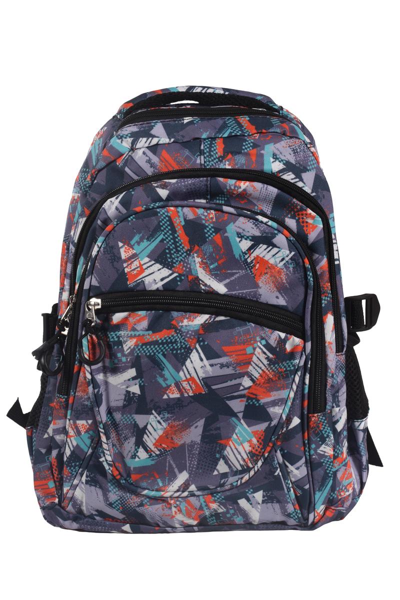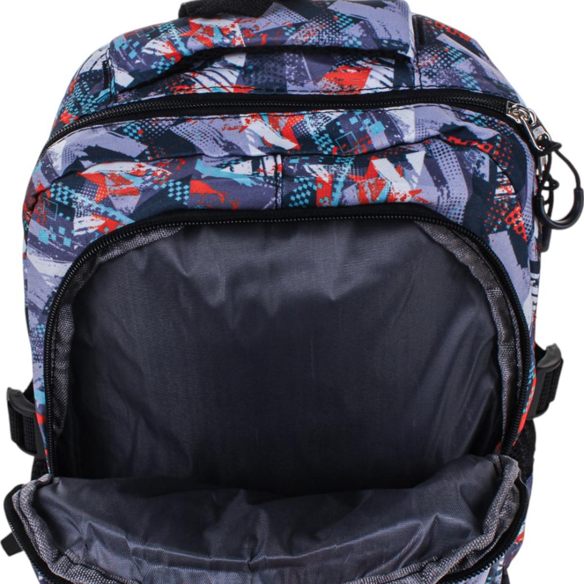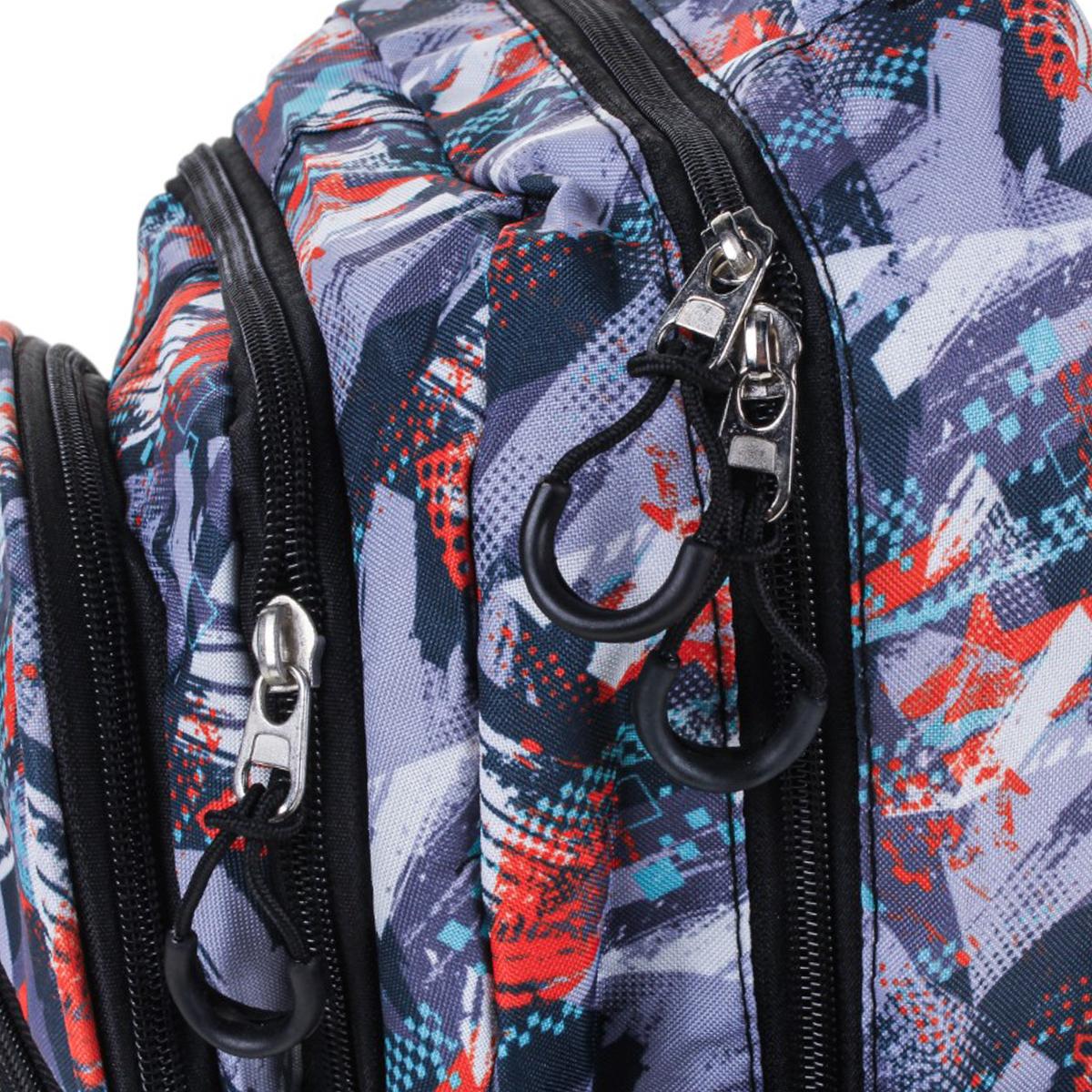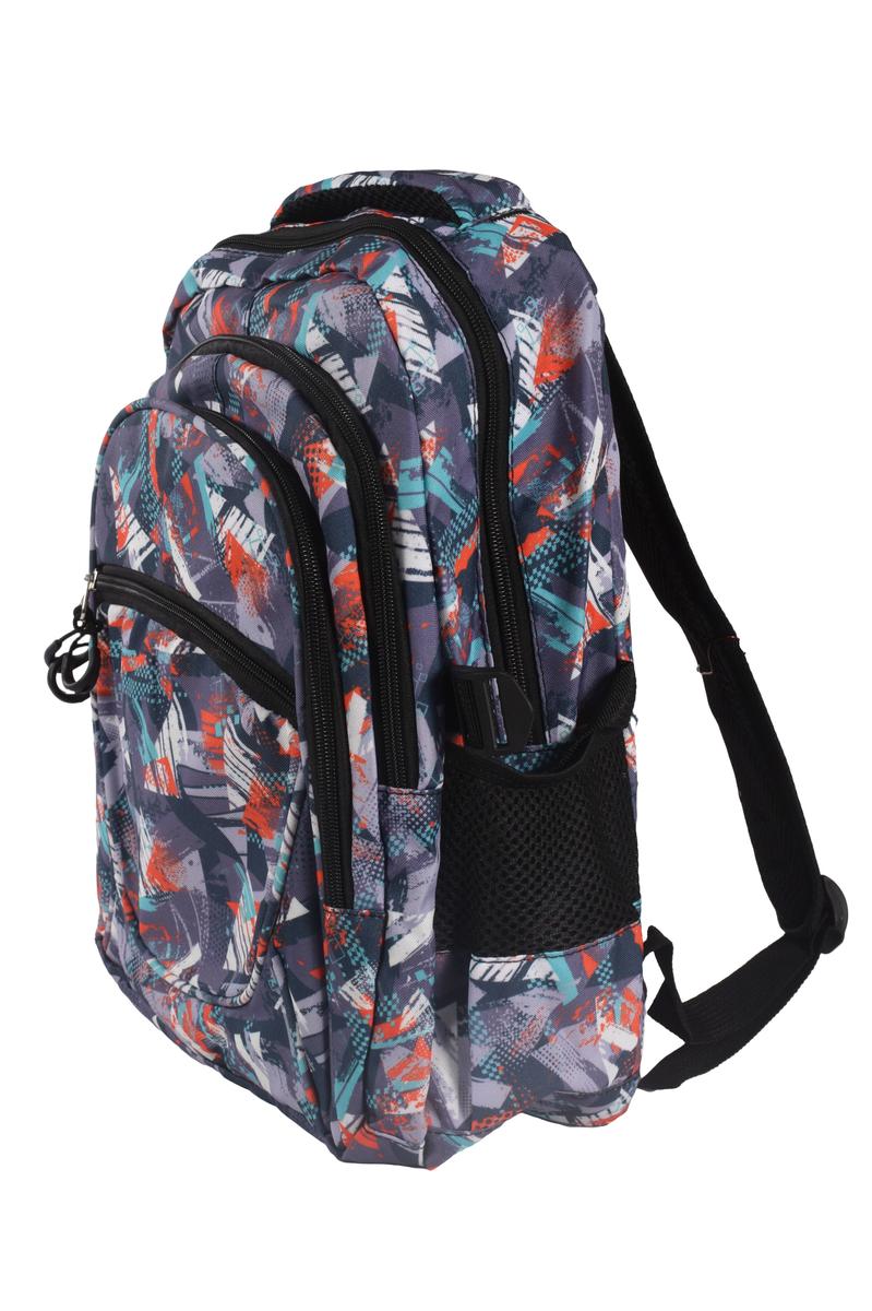 Рюкзак изготовлен из прочного текстиля, устойчивого к износу. Мягкие регулируемые лямки обеспечивают комфорт даже при длительном ношении. Абстрактный принт в серых, синих и красных тонах делает модель универсальной и стильной.