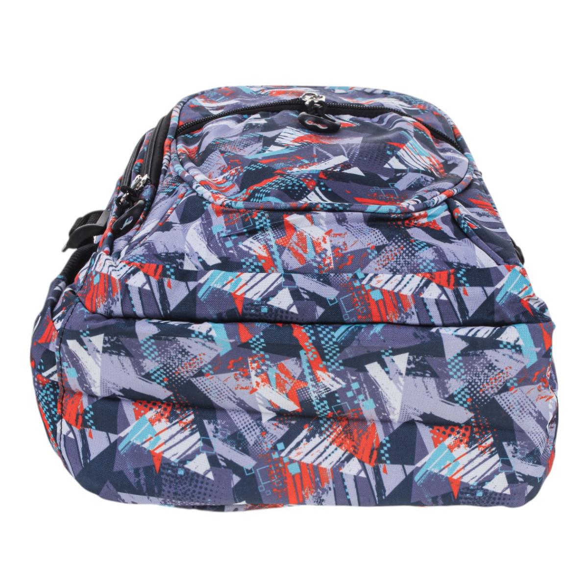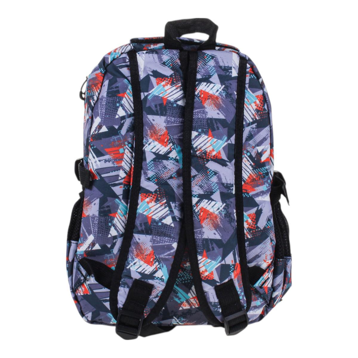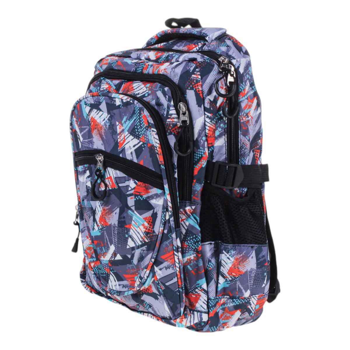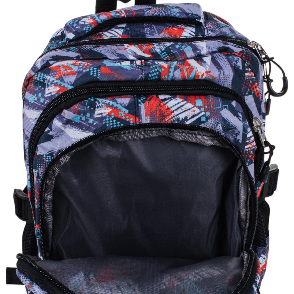Рюкзак изготовлен из прочного текстиля, устойчивого к износу. Мягкие регулируемые лямки обеспечивают комфорт даже при длительном ношении. Абстрактный принт в серых, синих и красных тонах делает модель универсальной и стильной.