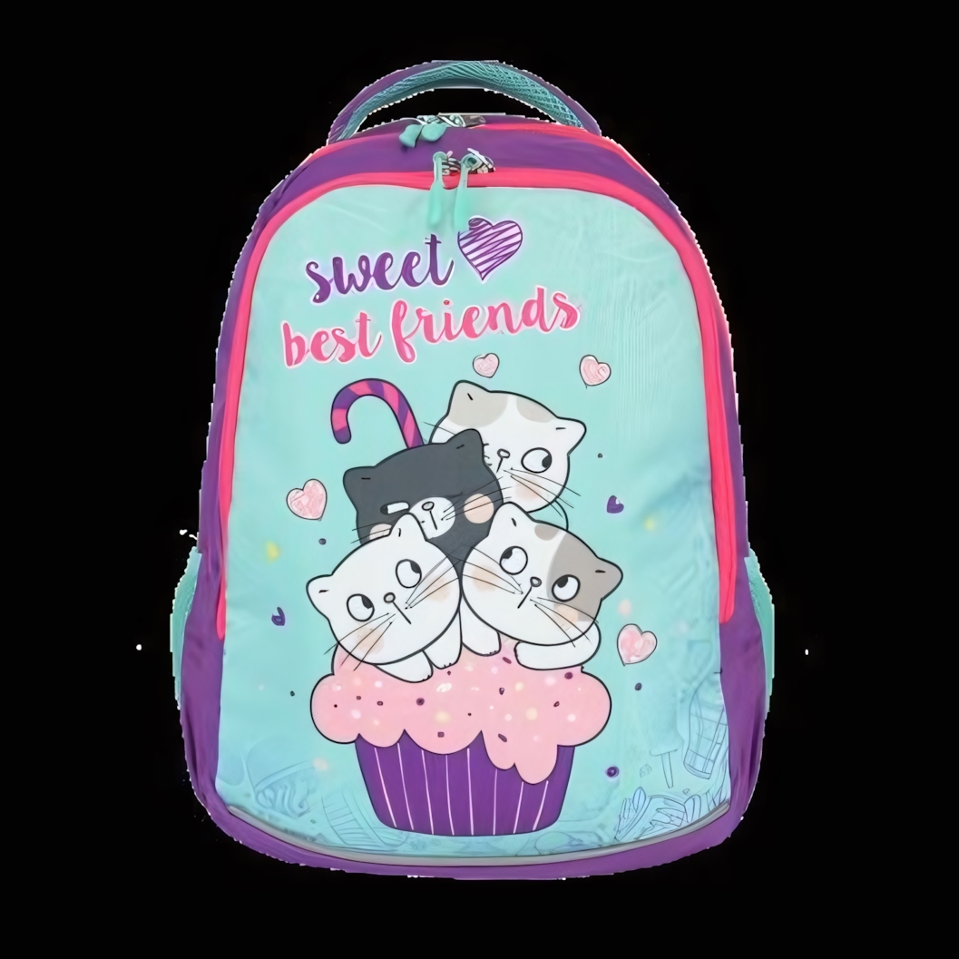 Голубой фон с розово-фиолетовыми акцентами и забавными иллюстрациями котят создаёт позитивное настроение. Яркая фурнитура и контрастная подкладка с узорами делают рюкзак заметным в толпе. Надпись «best friends» подчеркивает тематику дружбы и веселья.