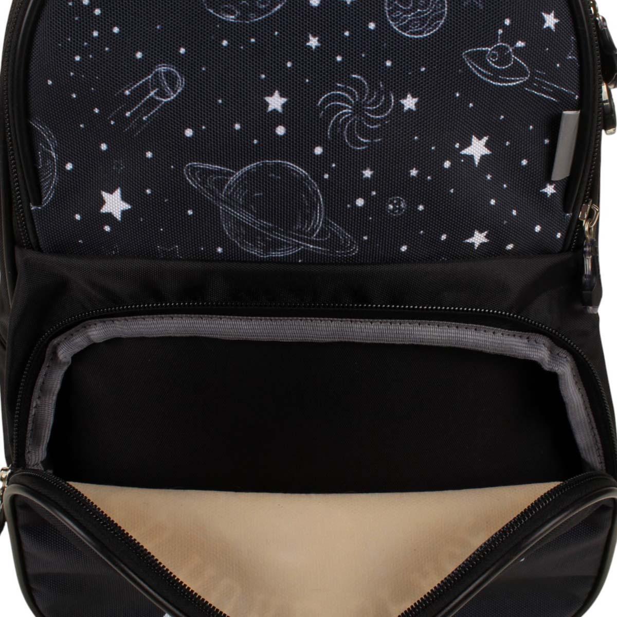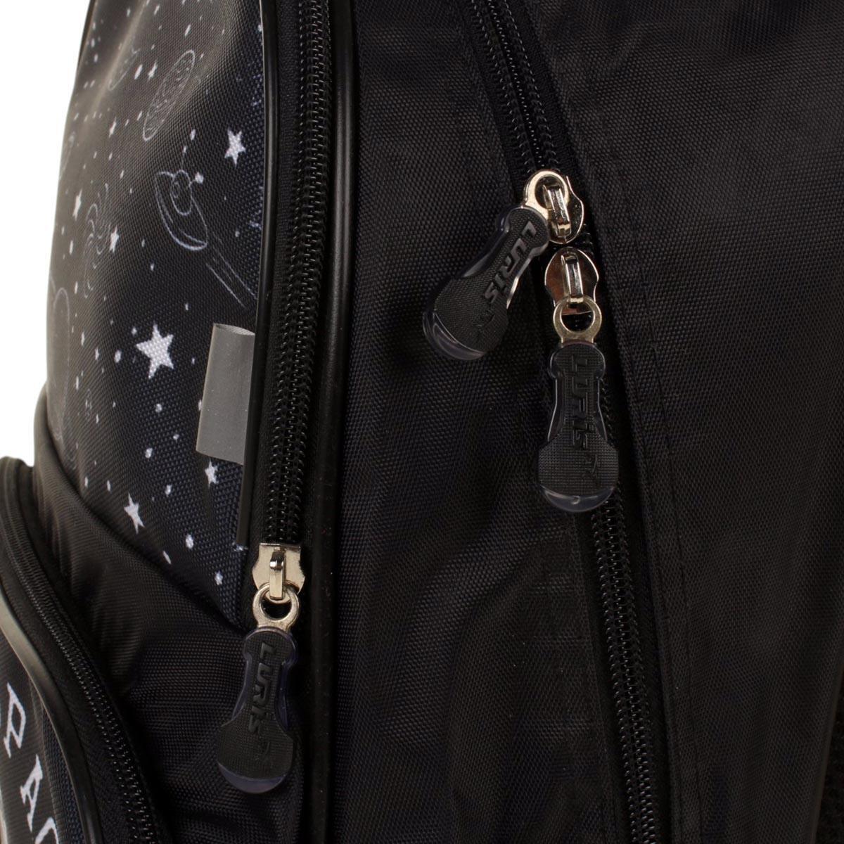 Космический принт на черном фоне придется по душе юным мечтателям и любителям активного образа жизни. Размер 37х26х13 см идеально подходит для учебников и тетрадей.