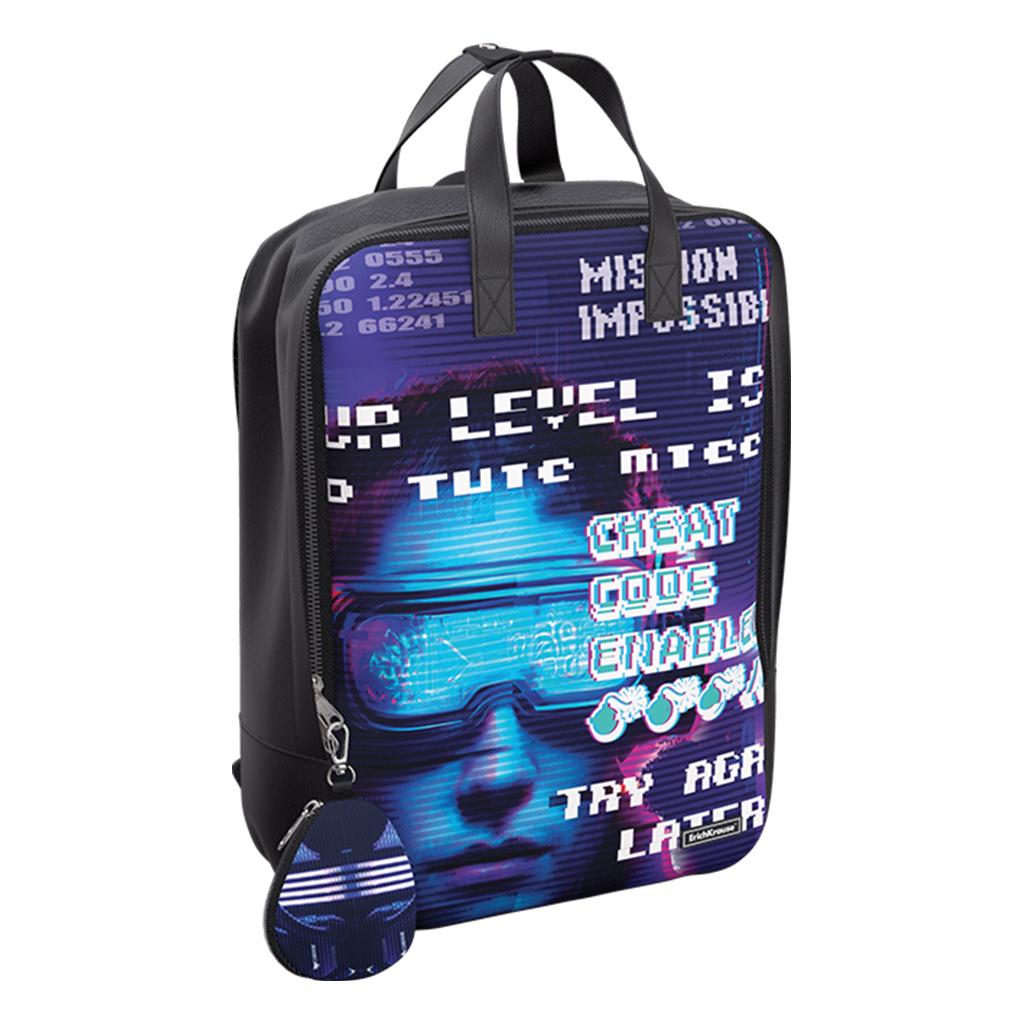Обозначения на внешней части вдохновляют на новые достижения: стильный дизайн с пиксельной графикой и яркими надписями делает модель привлекательной для геймеров и активных городских жителей. Классическая цветовая гамма в черном с синими и фиолетовыми акцентами универсальна и хорошо сочетается с любой одеждой. Многофункциональность и стиль сочетаются в этом компактном и практичном рюкзаке.