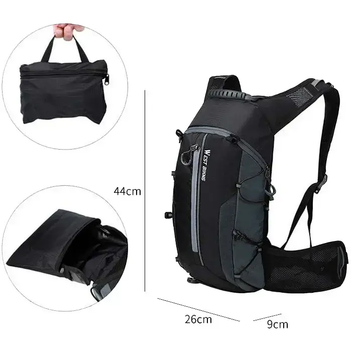 Размеры рюкзака составляют 44 см в высоту, 26 см в ширину и 9 см в глубину, что делает его компактным и легким для переноски. Он легко складывается в компактный пакет, что удобно для хранения. Рюкзак West Biking — это не просто аксессуар, а надежный помощник в ваших приключениях на свежем воздухе.