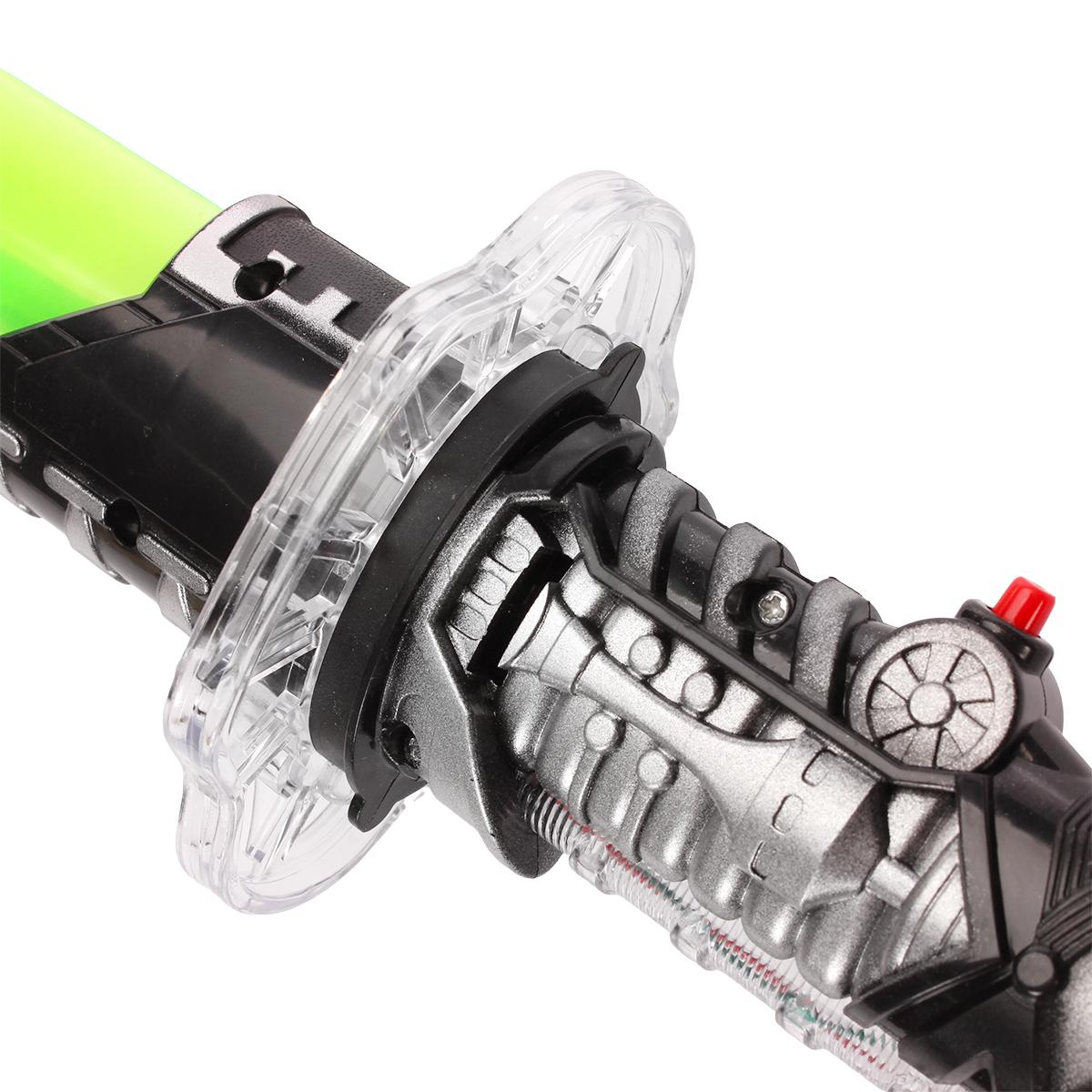 Прочный материал выдерживает активное использование, а компактные размеры (76 см) позволяют удобно хранить игрушку. Для работы световых элементов требуются батарейки типа АА (не входят в комплект).