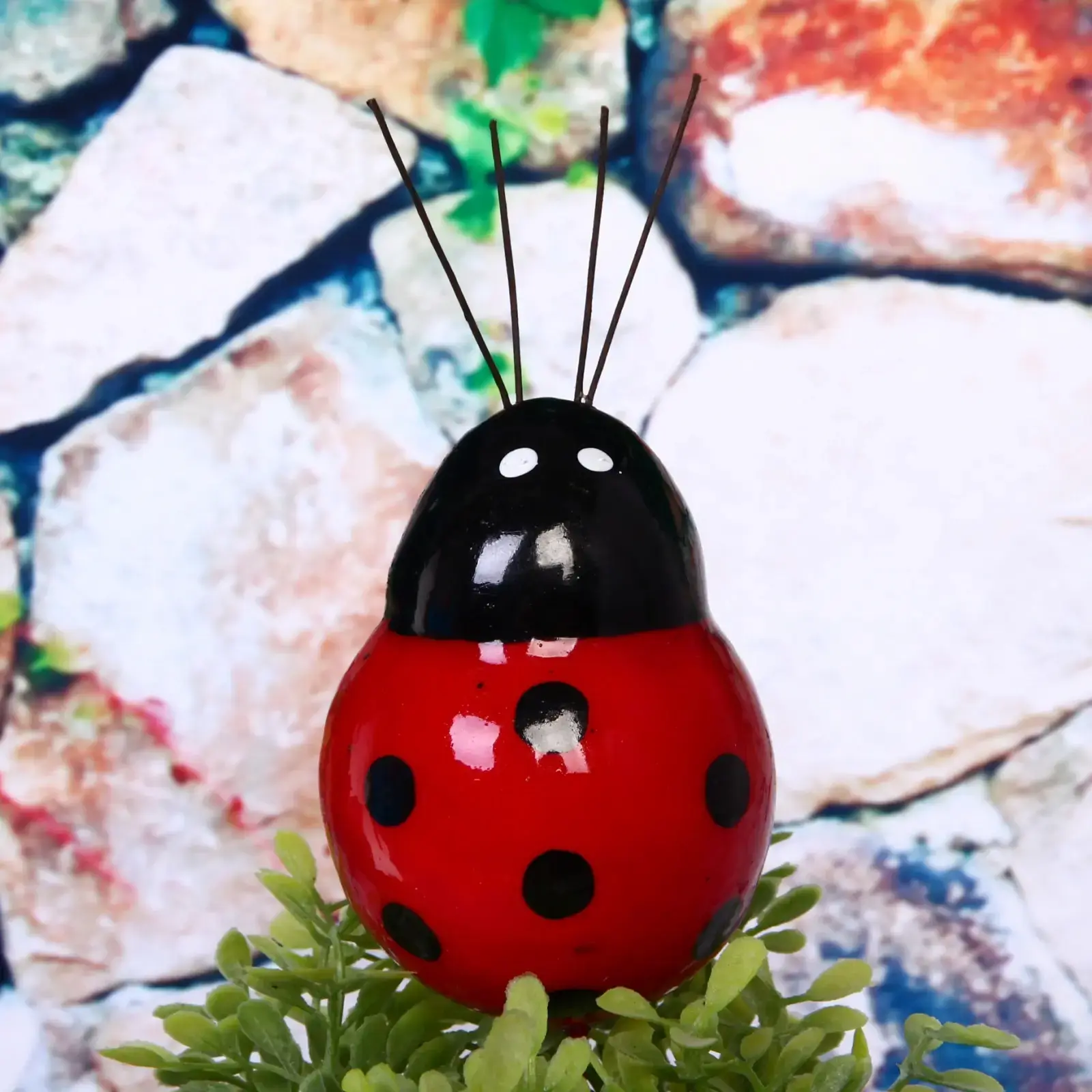 Фигурка имеет размеры 12х6 см и общую высоту 18 см, что делает её компактной и удобной для размещения в любом уголке вашего сада или на балконе. Установленная на деревянной палочке, она легко втыкается в землю и надежно держится, даже при сильном ветре. Яркие красные и черные цвета привлекают внимание и создают атмосферу уюта и радости.