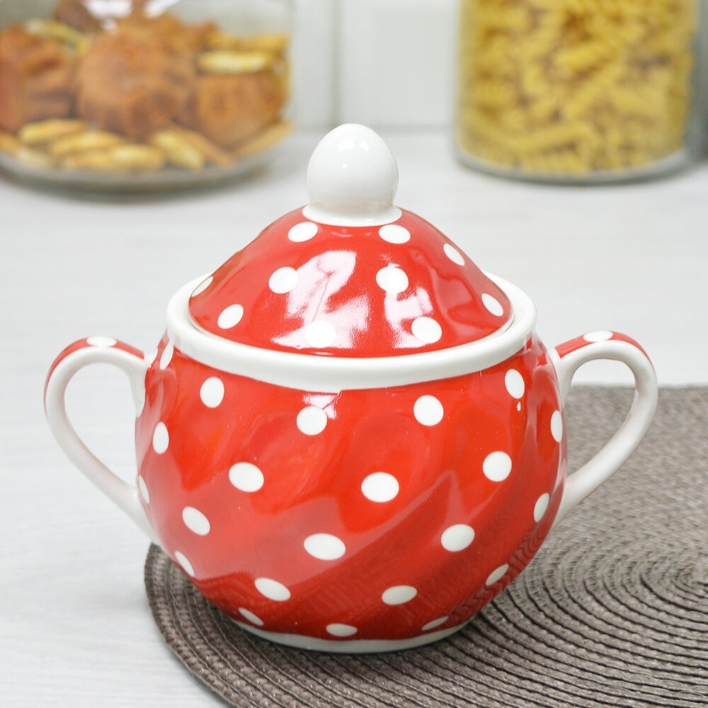 Сахарница фарфоровая "Красный горох", 400мл, красная с белым горошком