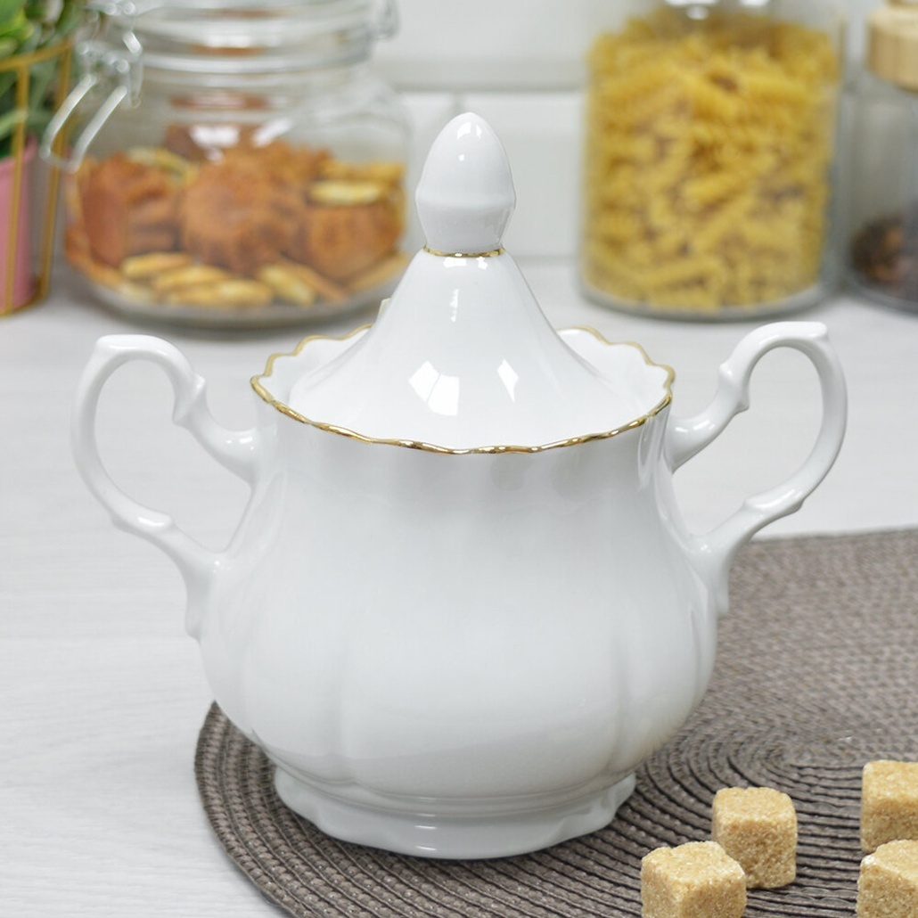 Сахарница объемом 550 мл из белого фарфора — это идеальное решение для хранения сахара, которое добавит изысканности вашему столу. Благодаря закругленным формам и золотому ободку, она станет не только функциональным, но и стильным элементом вашего интерьера.