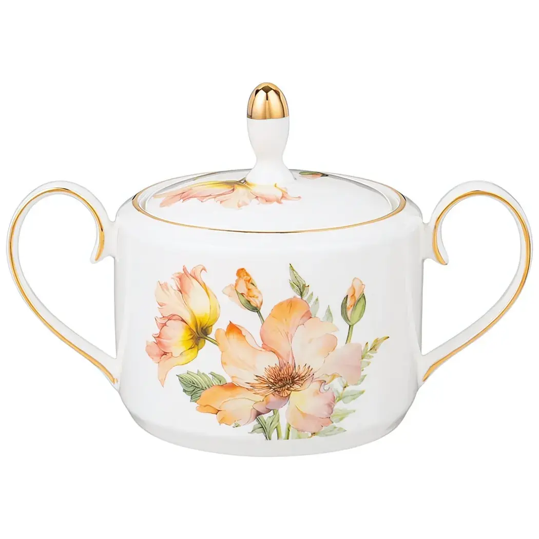 Сахарница фарфоровая «SENSE» — это не просто посуда, а элемент, который добавит уют и стиль в ваш дом. Изготовленная из качественного тонкого фарфора, она станет идеальным дополнением к вашему столу и поднимет настроение на целый день. Нежные цветочные узоры в пастельных тонах, включая розовые и желтые цветы, создают атмосферу тепла и уюта, а золотистые детали придают изделию элегантность.