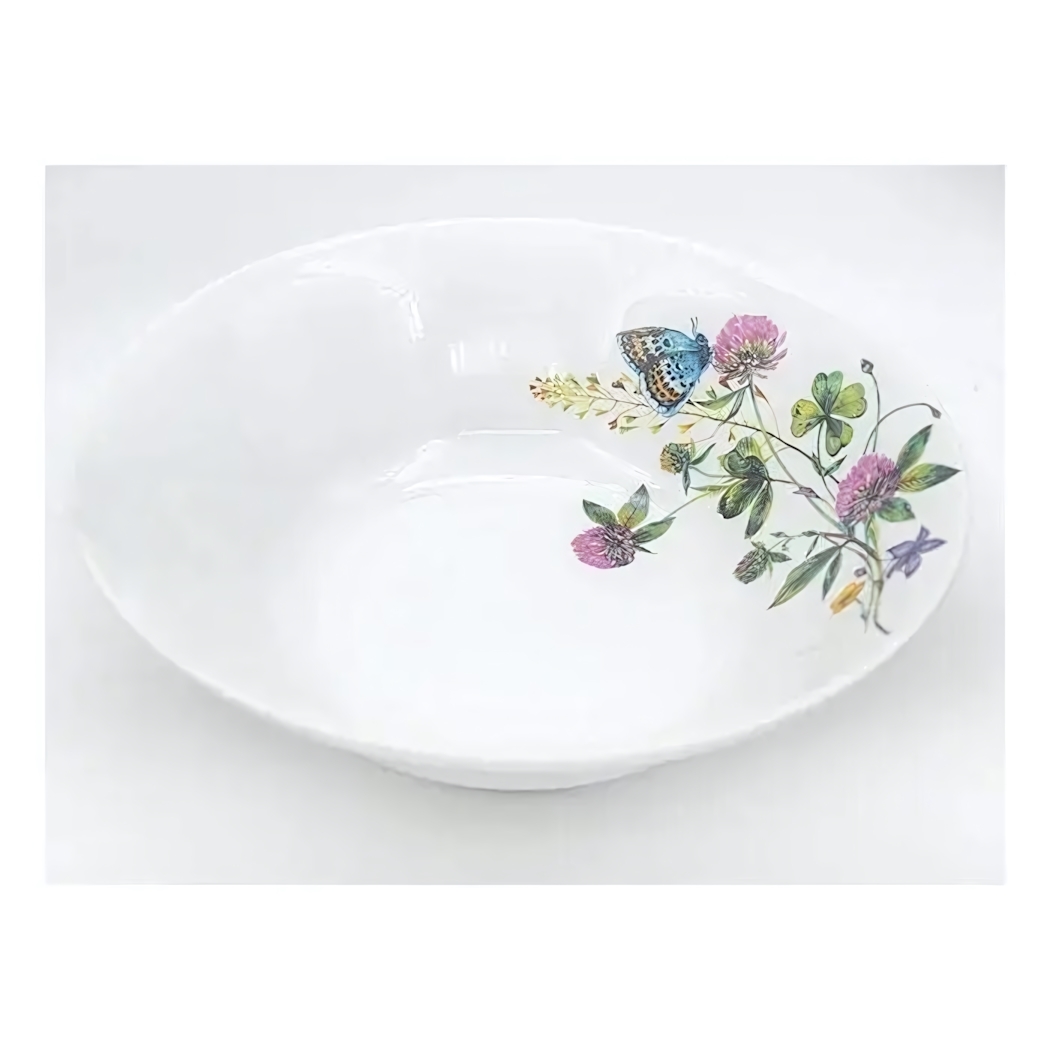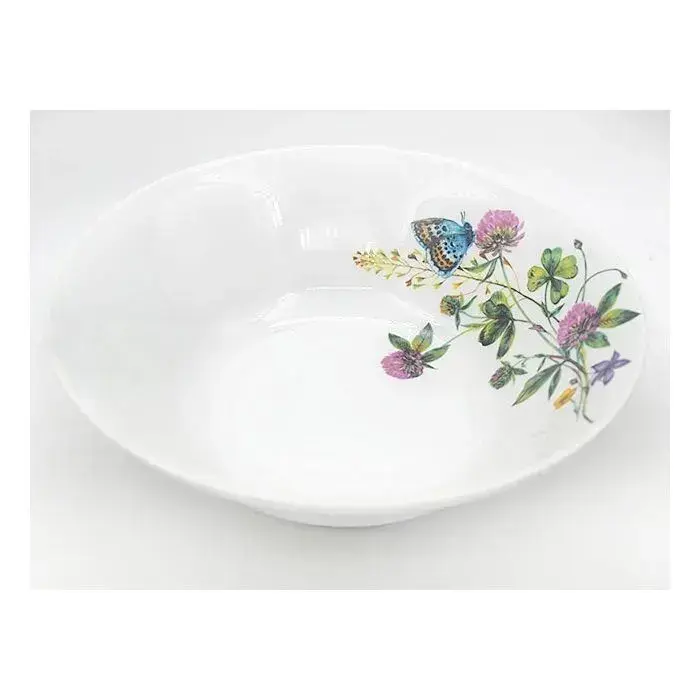 Уникальный дизайн с тонкой прорисовкой цветов и бабочек создан методом ручной деколи. Овальная форма обеспечивает удобное хранение в шкафу и эффектную подачу на праздничном столе. Утолщённые бортики предотвращают проливание, а глубокая чаша сохраняет температуру блюд.