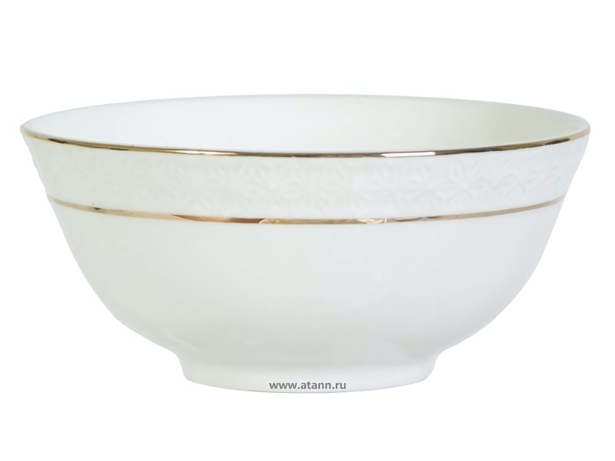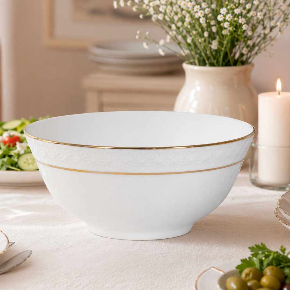 Идеально подходит для сервировки салатов, закусок и десертов в домашних или ресторанных условиях. Благодаря высококачественному фарфору, салатник обладает прочностью, устойчивостью к царапинам и долгим сроком службы. Он выполнен в классическом белом цвете с тонкими золотистыми линиями, что добавляет изысканности любому интерьеру.